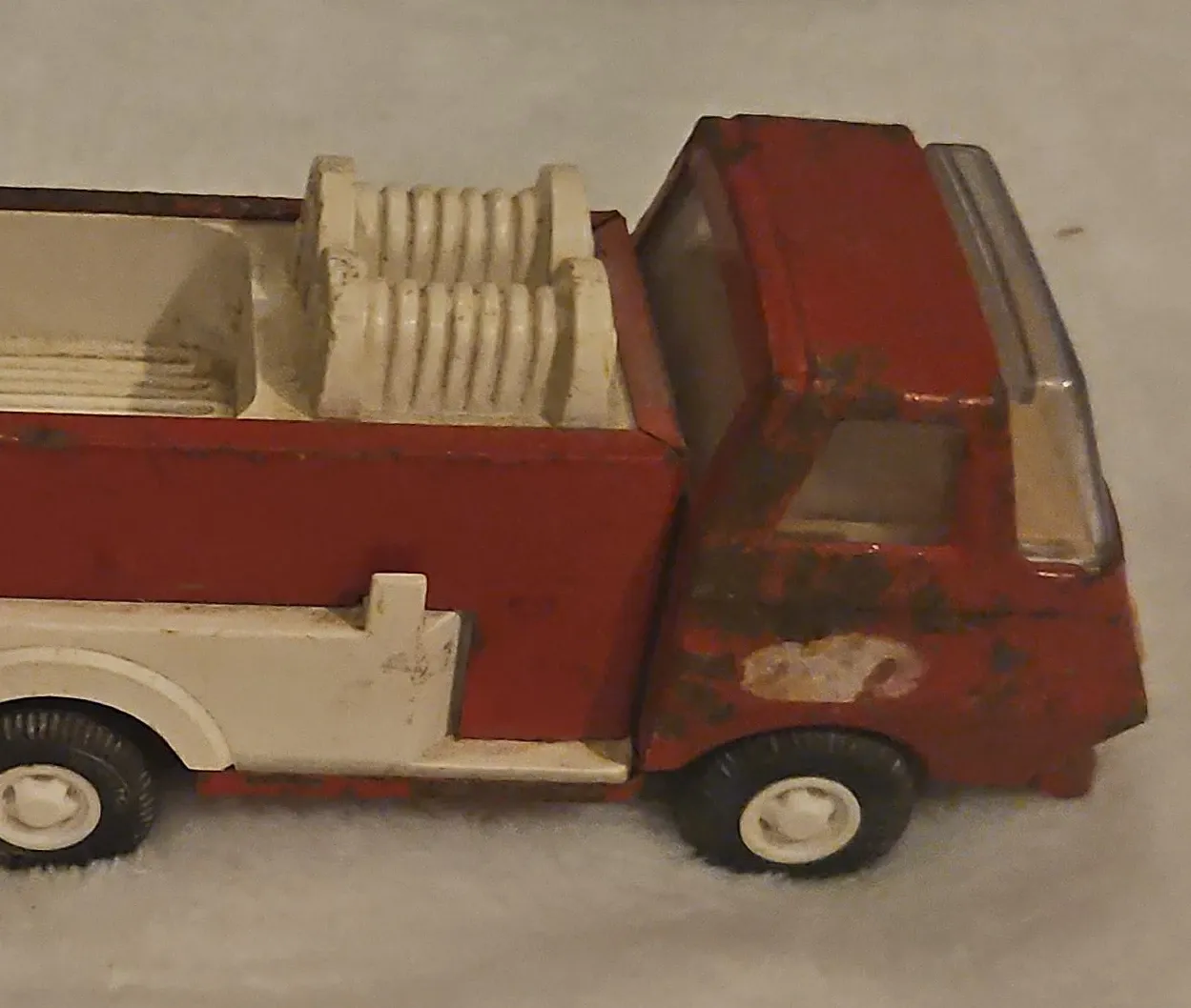 Selling a vintage Tonka fire truck in red and white. It shows signs of wear and tear, adding to its charm and character. Perfect for collectors or as a nostalgic toy!