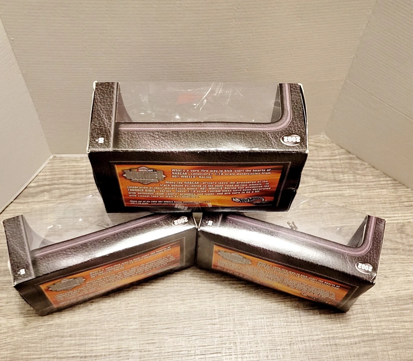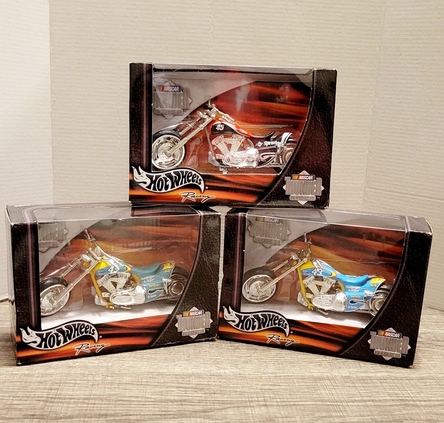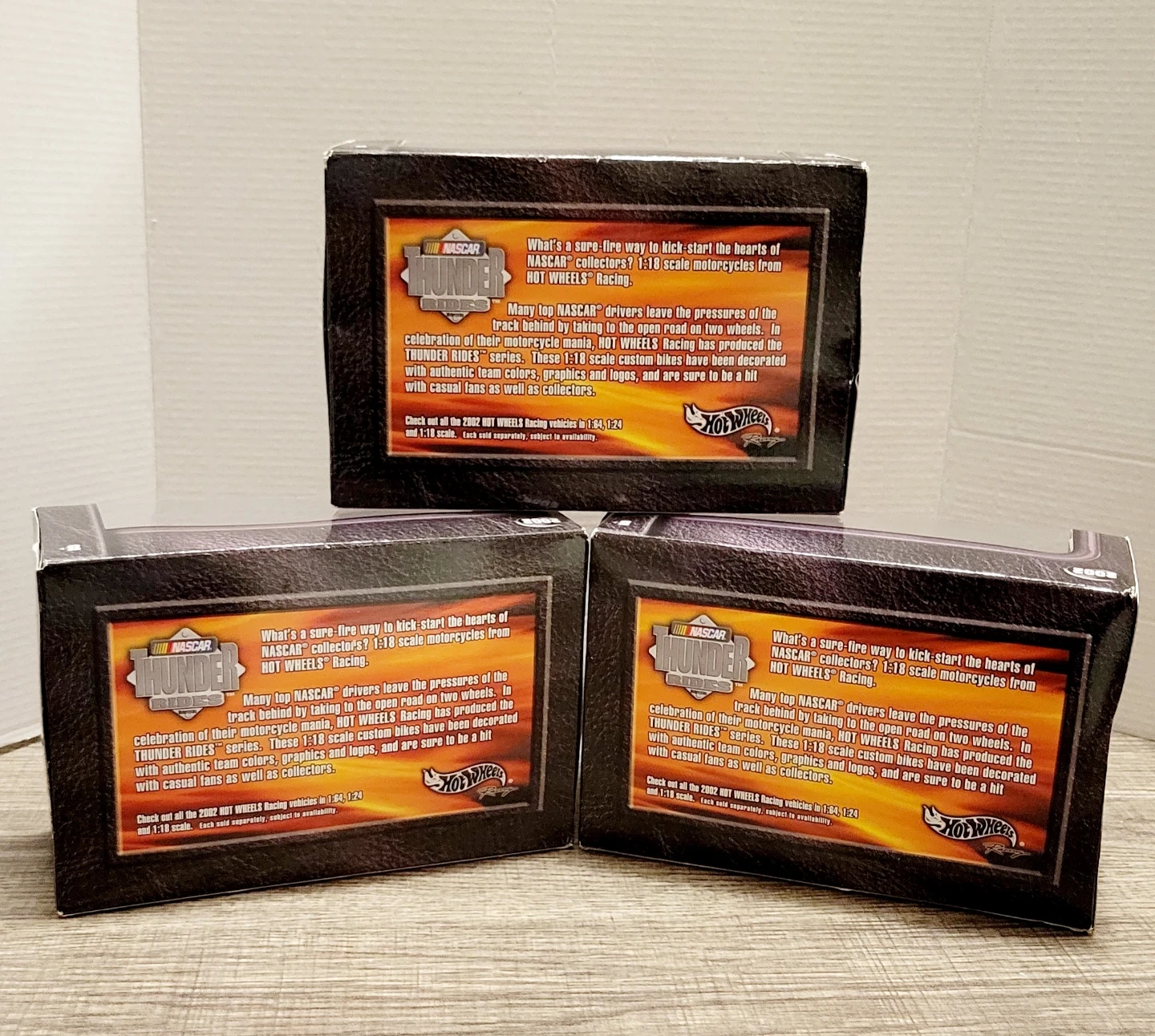 Selling a set of Hot Wheels NASCAR Thunder Riders 1:18 scale motorcycles. These are custom bikes decorated with authentic team colors, graphics, and logos. Check out the 2002 Hot Wheels Racing vehicles!