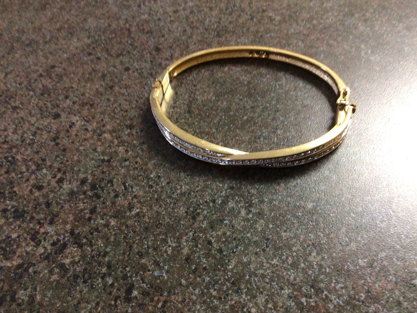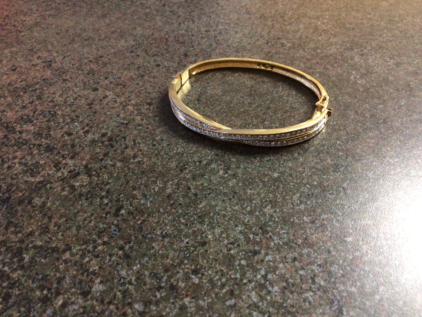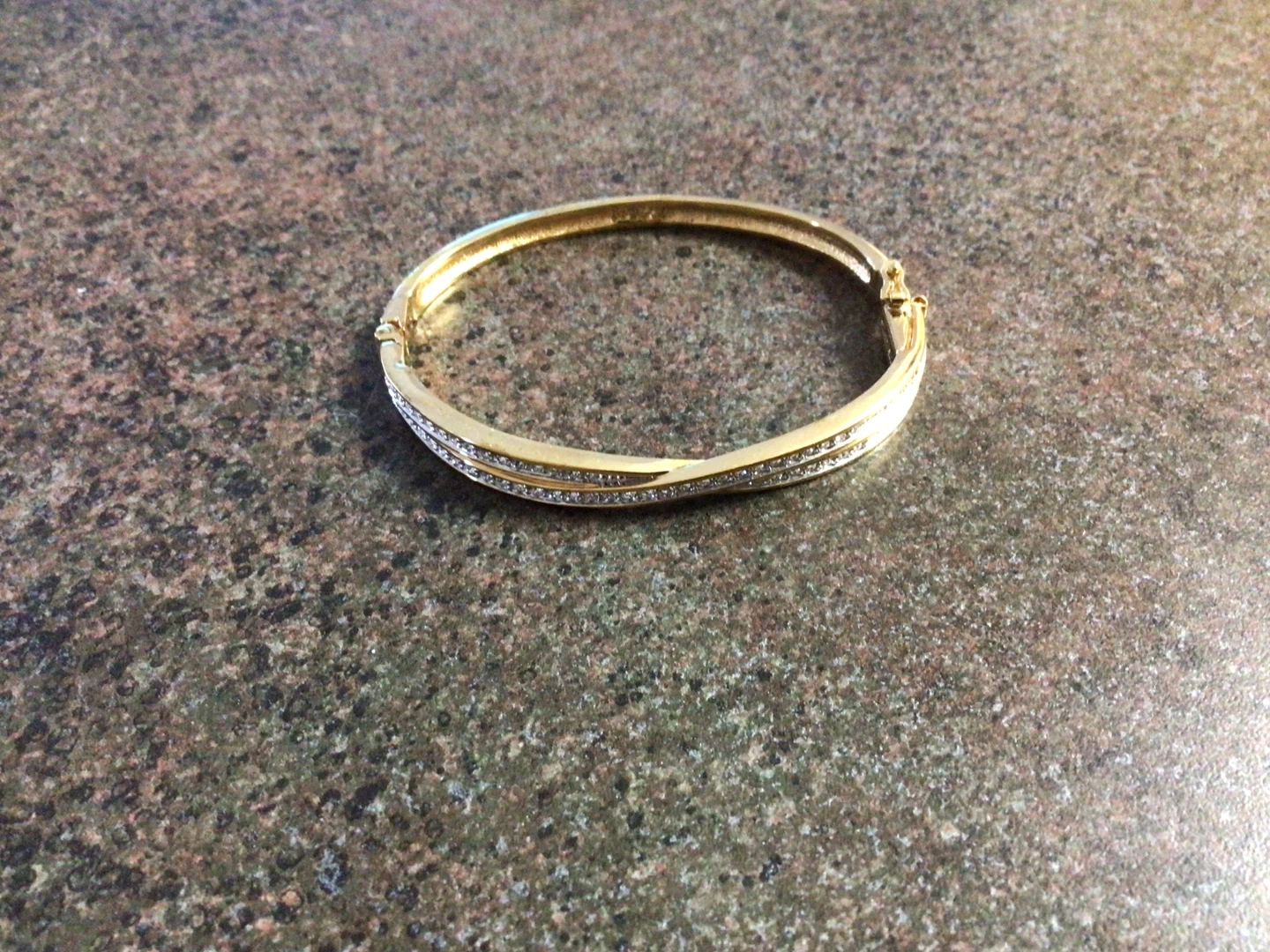 A lovely gold tone bangle bracelet with a secure clasp. It features a double row of sparkling accents. Perfect for adding a touch of elegance to any outfit!