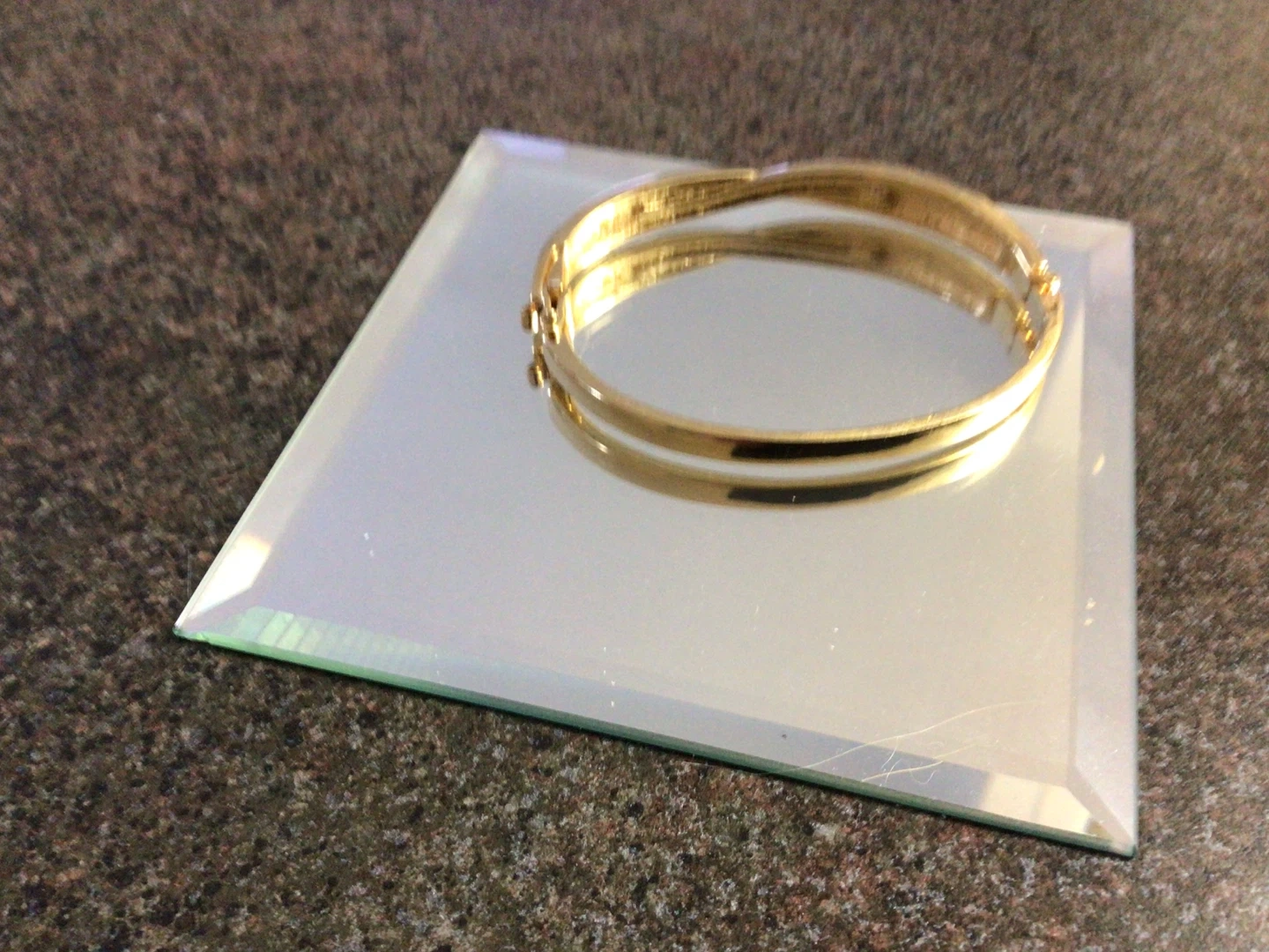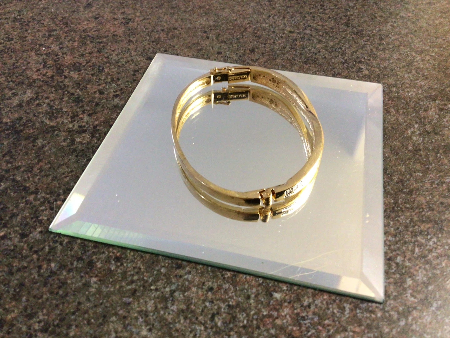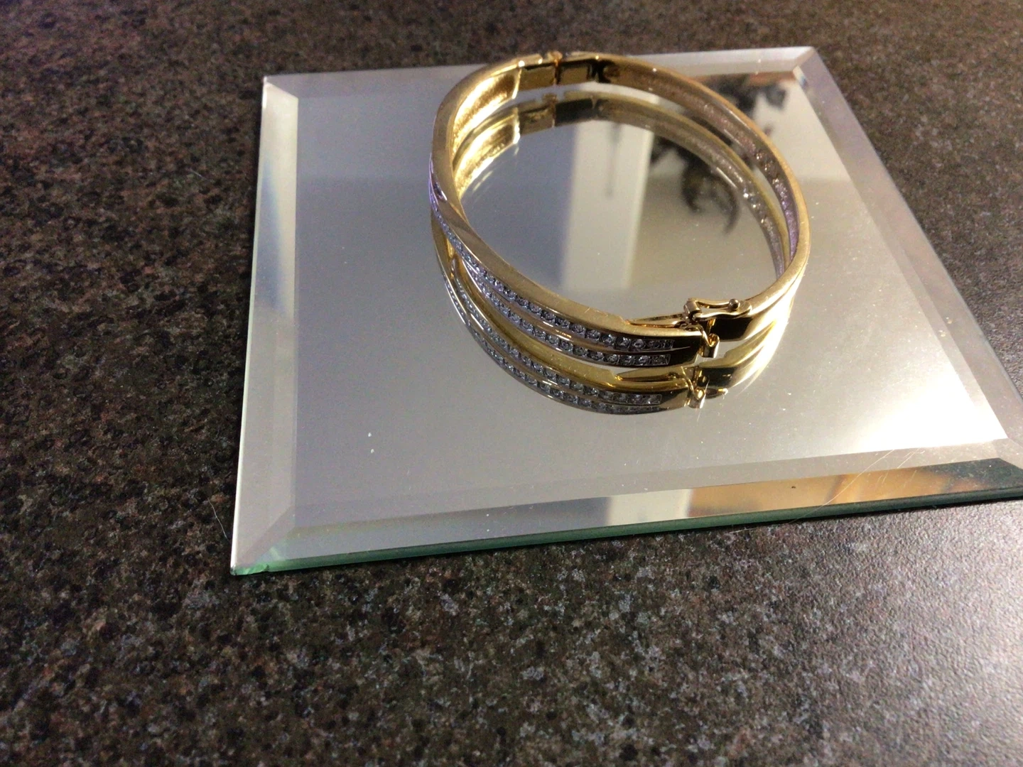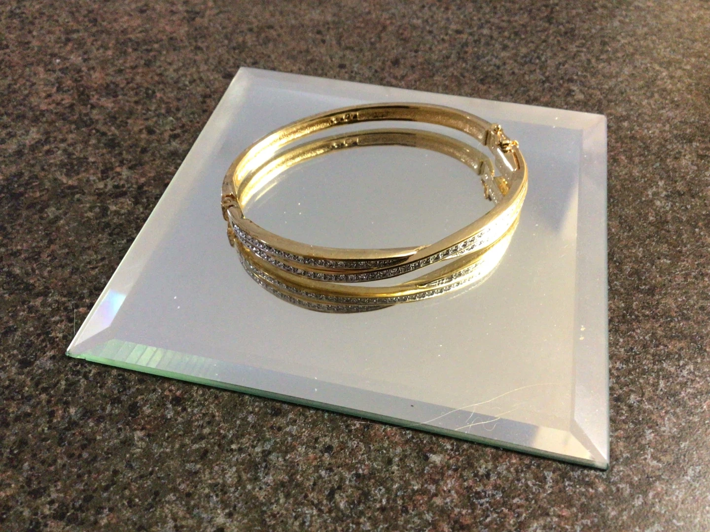 A lovely gold tone bangle bracelet with a secure clasp. It features a double row of sparkling accents. Perfect for adding a touch of elegance to any outfit!