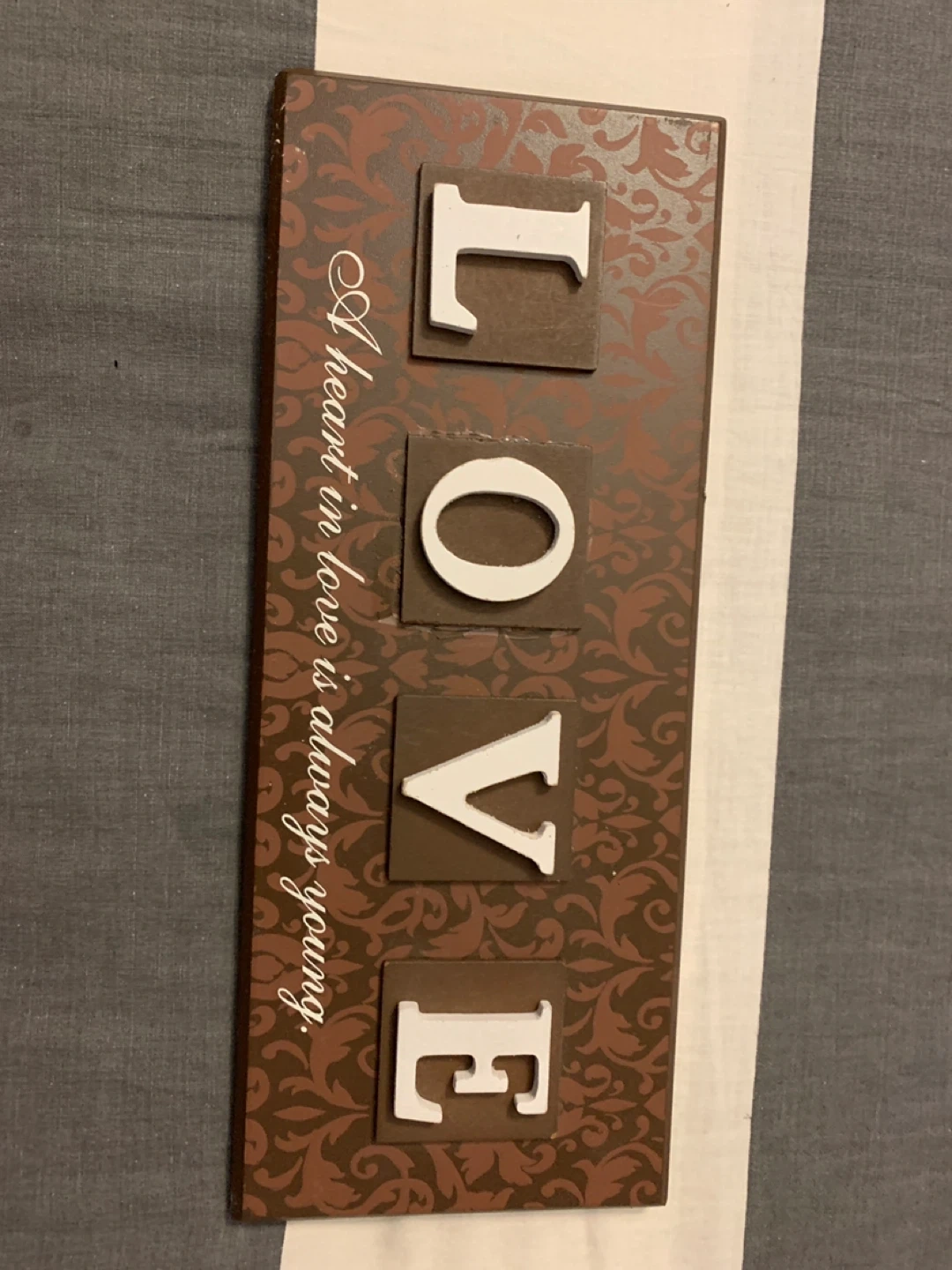A cute 'LOVE' wall decor piece! It's brown and white and reads 'A heart in love is always young'