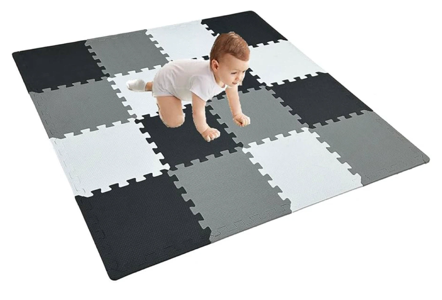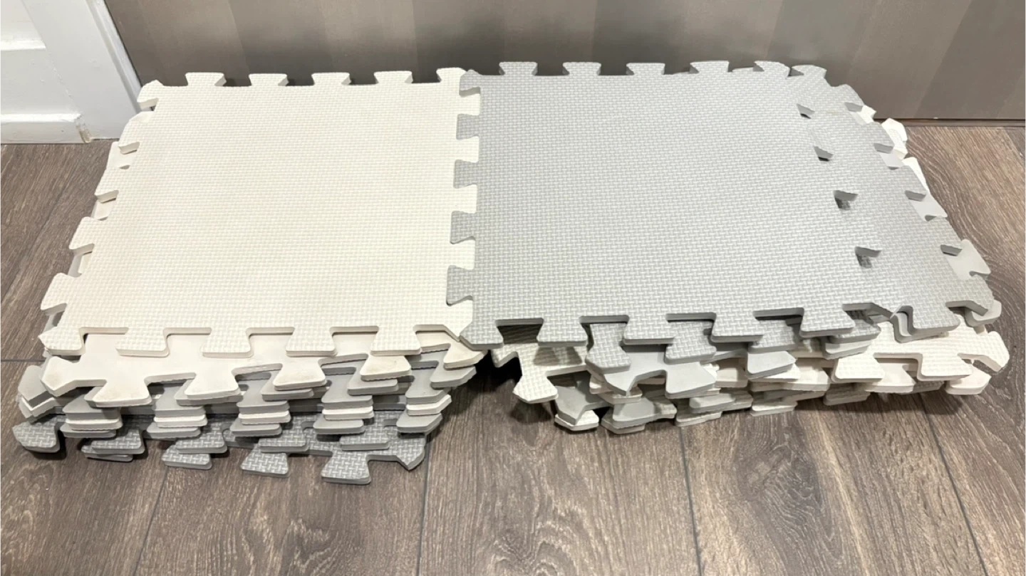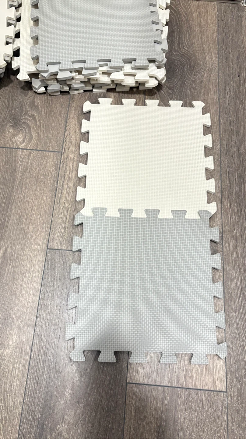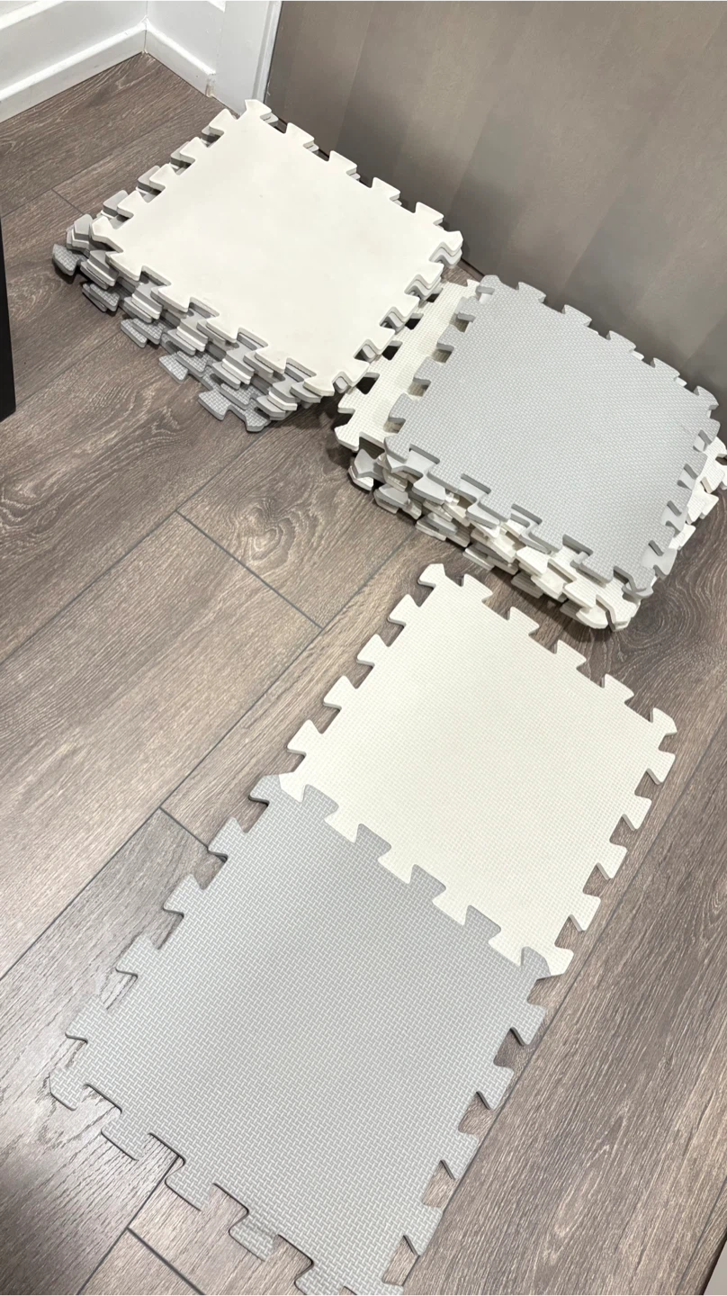 Selling a set of foam play mat tiles in grey and white! Each tile measures 30.5cm x 30.5cm. Perfect for creating a soft and safe play area for your little one
