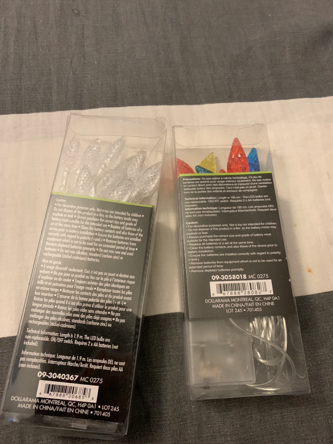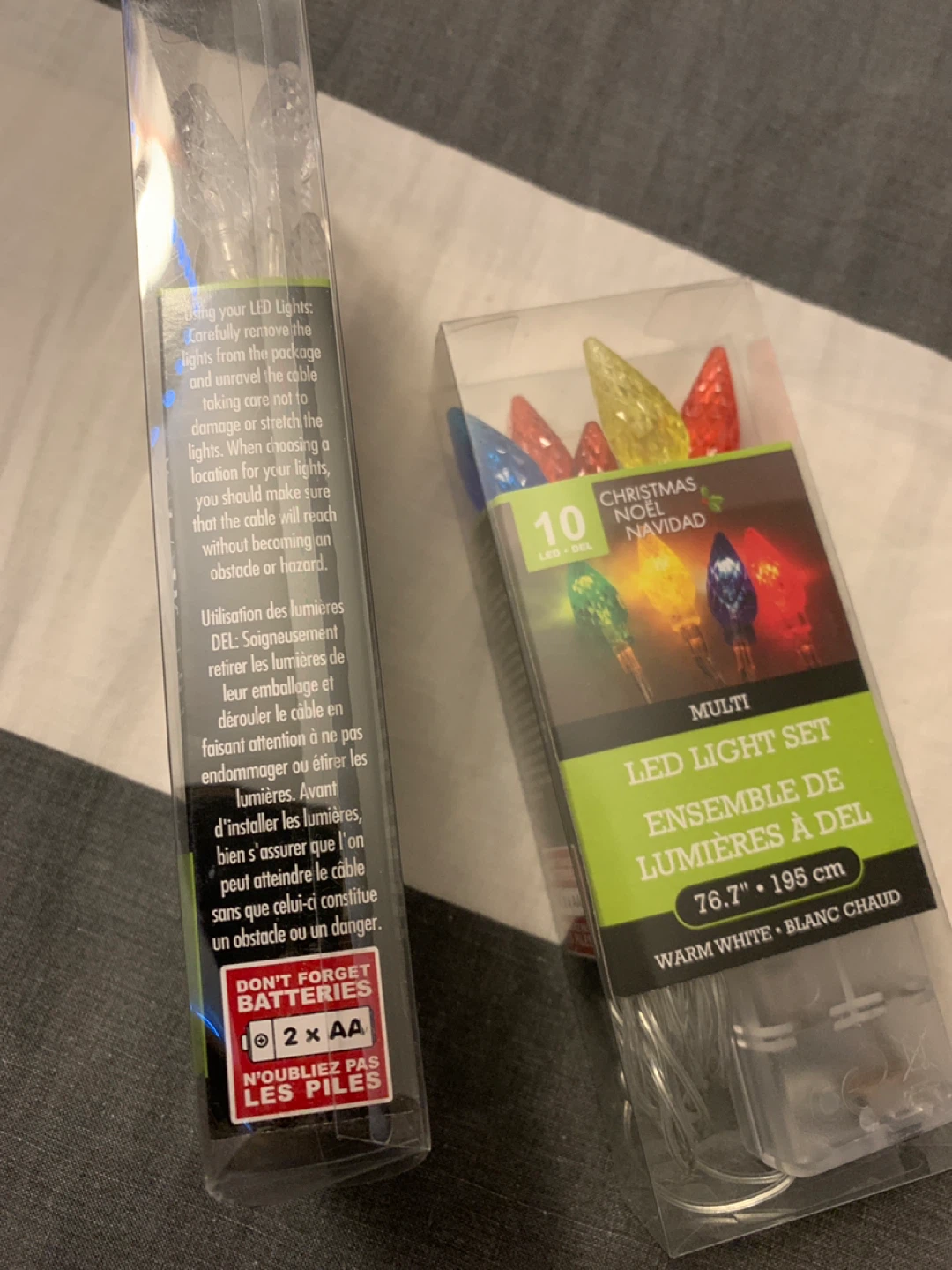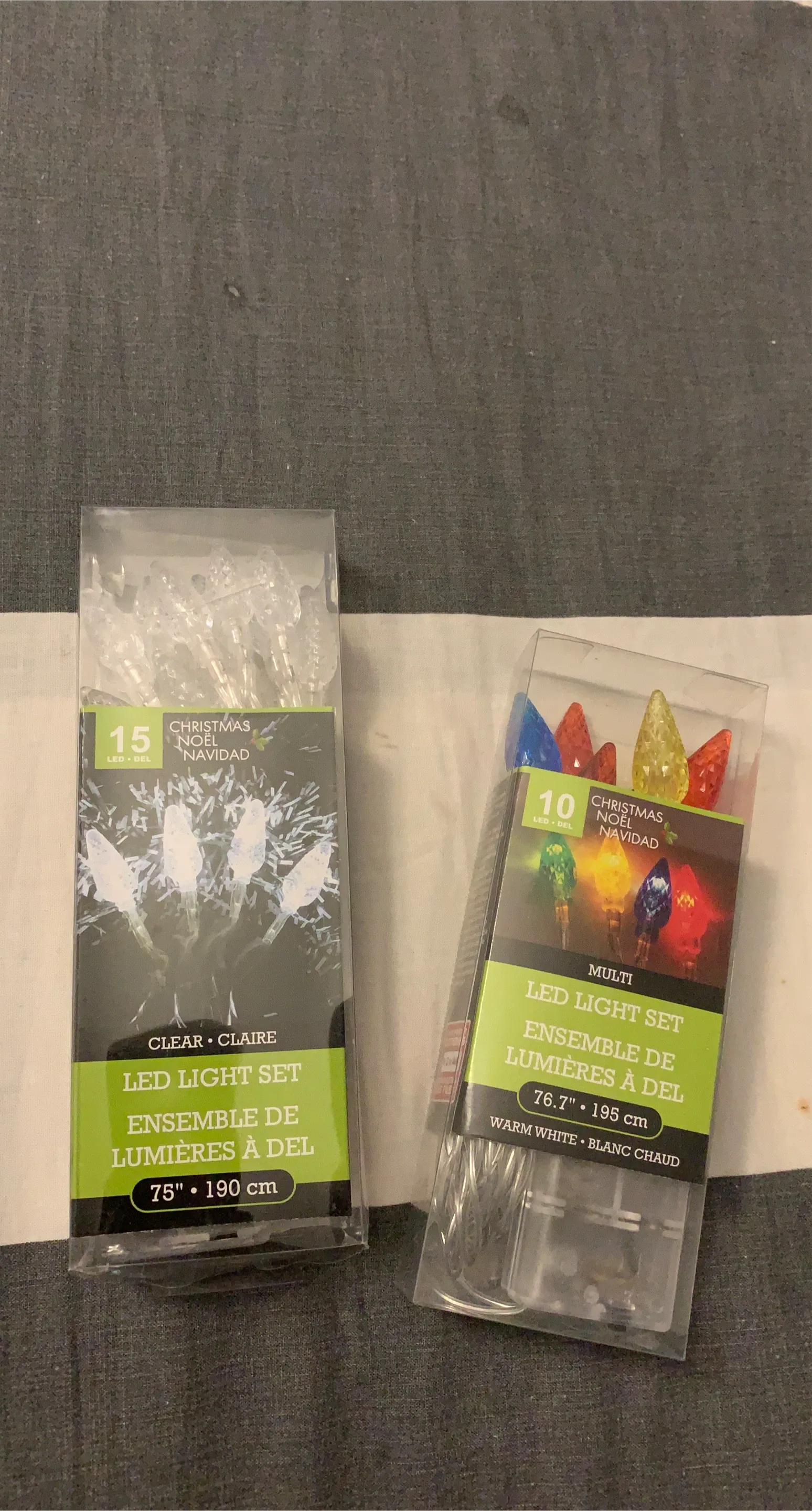 Selling two Christmas LED light sets! One is a clear set with 15 lights, and the other is a multi-coloured set with 10 lights. Both sets are 75" / 190 cm long and emit a warm white light. Batteries not included