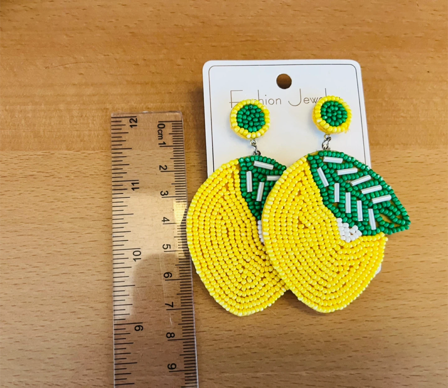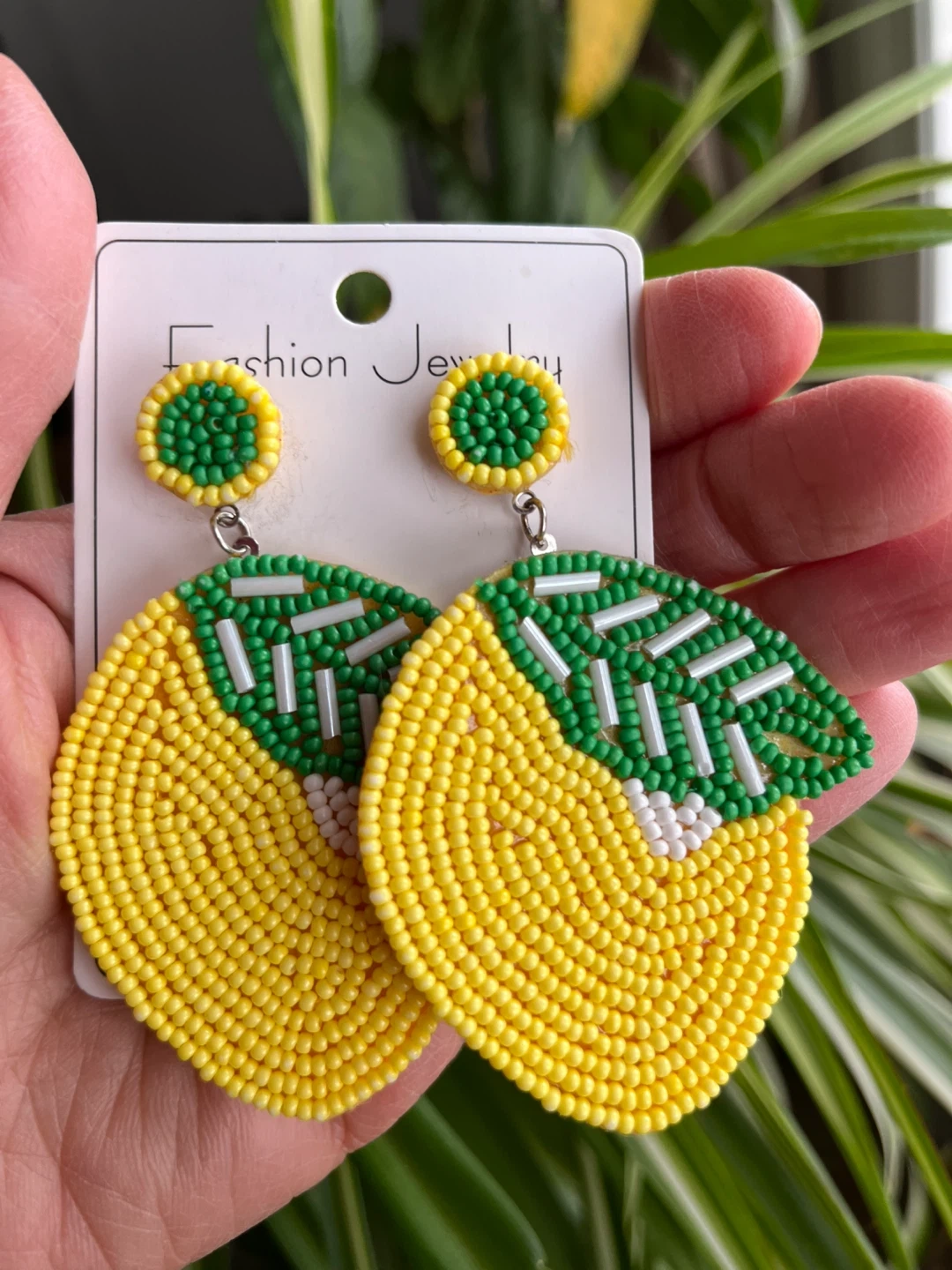 Cute beaded lemon earrings! The earrings have a yellow lemon with green and white accents. Neat finishing