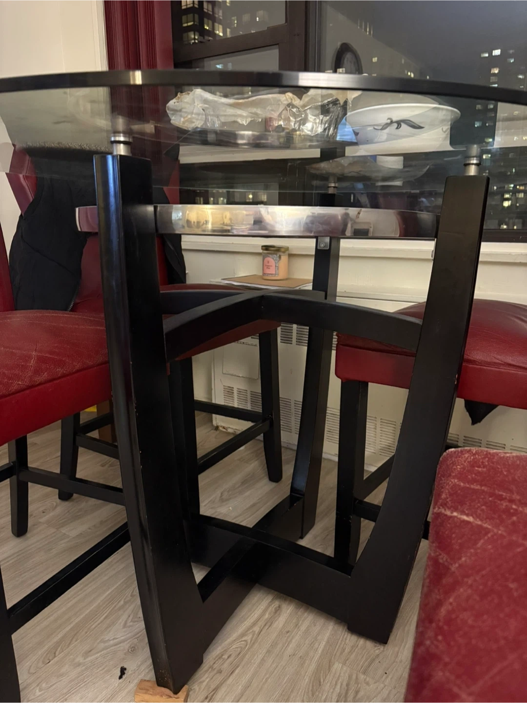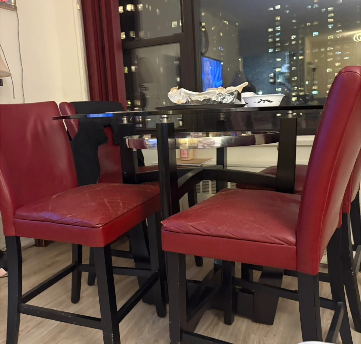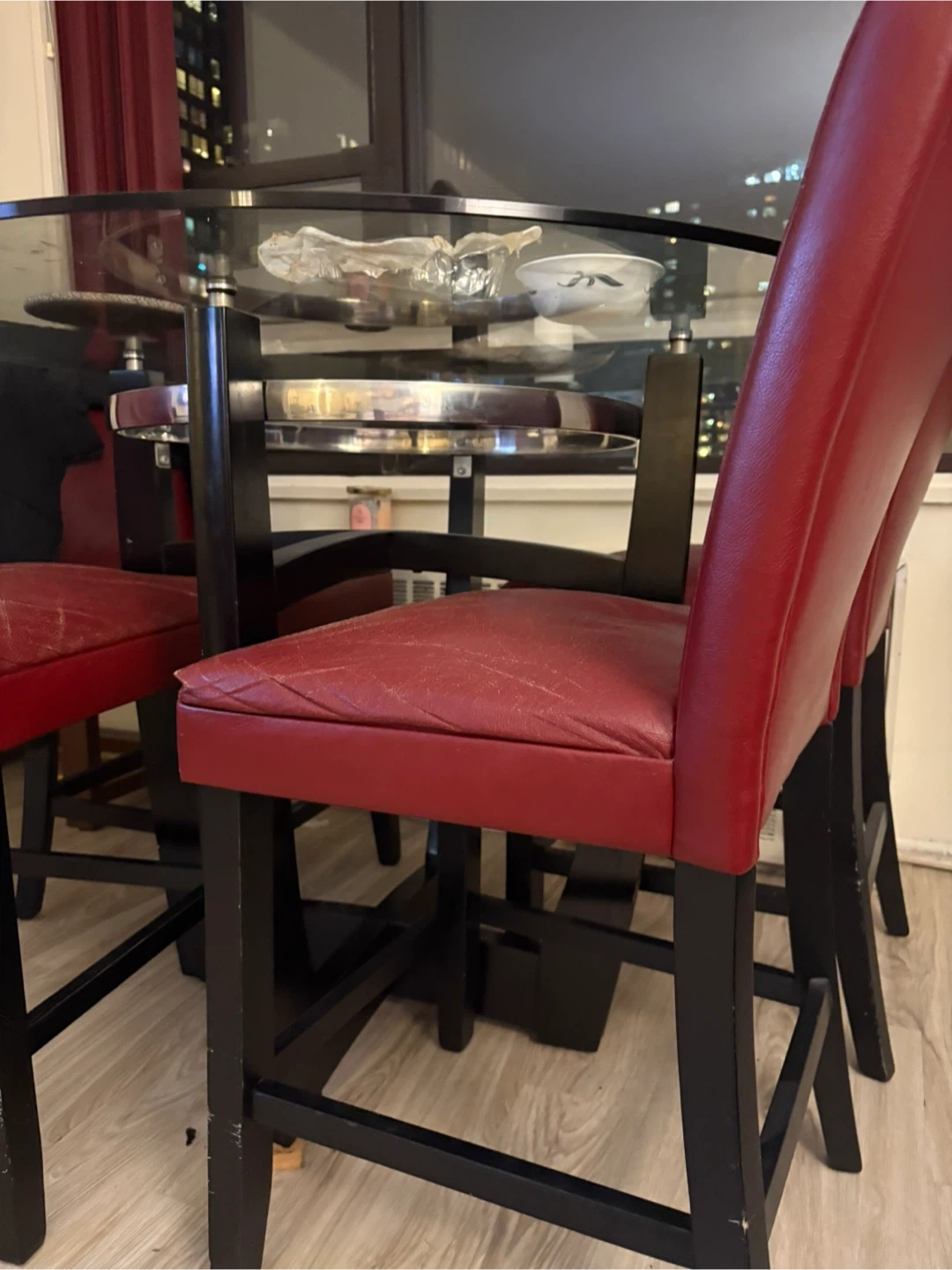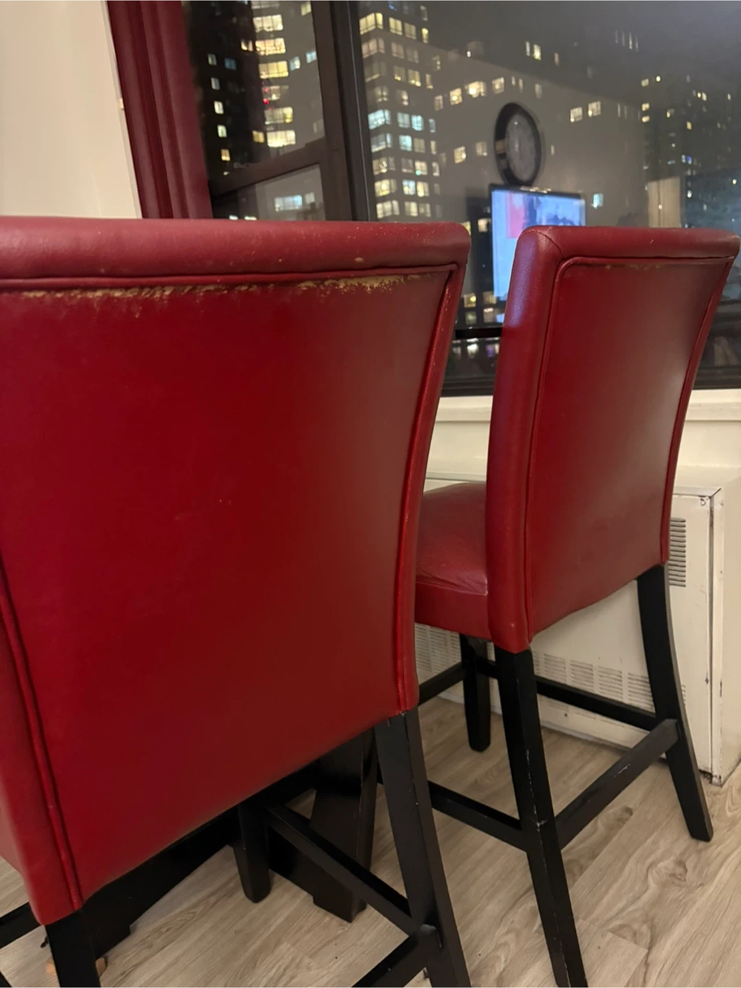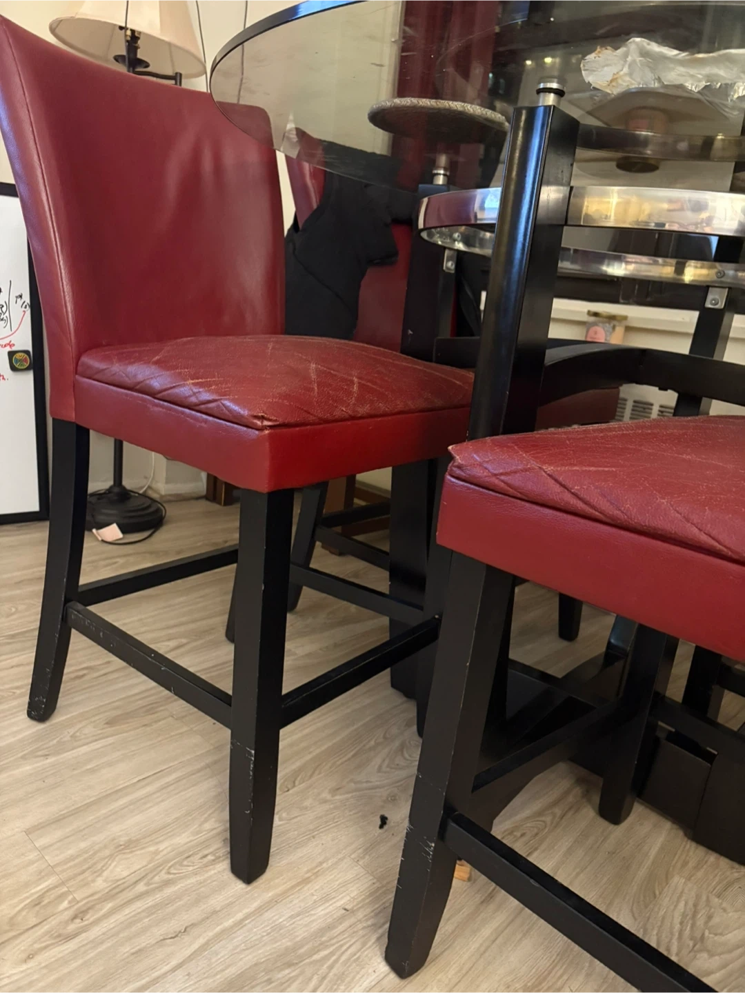 Selling a set of 4 bar stools. They feature a red leather seat and backrest with black wooden legs. There are some signs of wear and tear on the legs, but overall in good condition and sturdy!