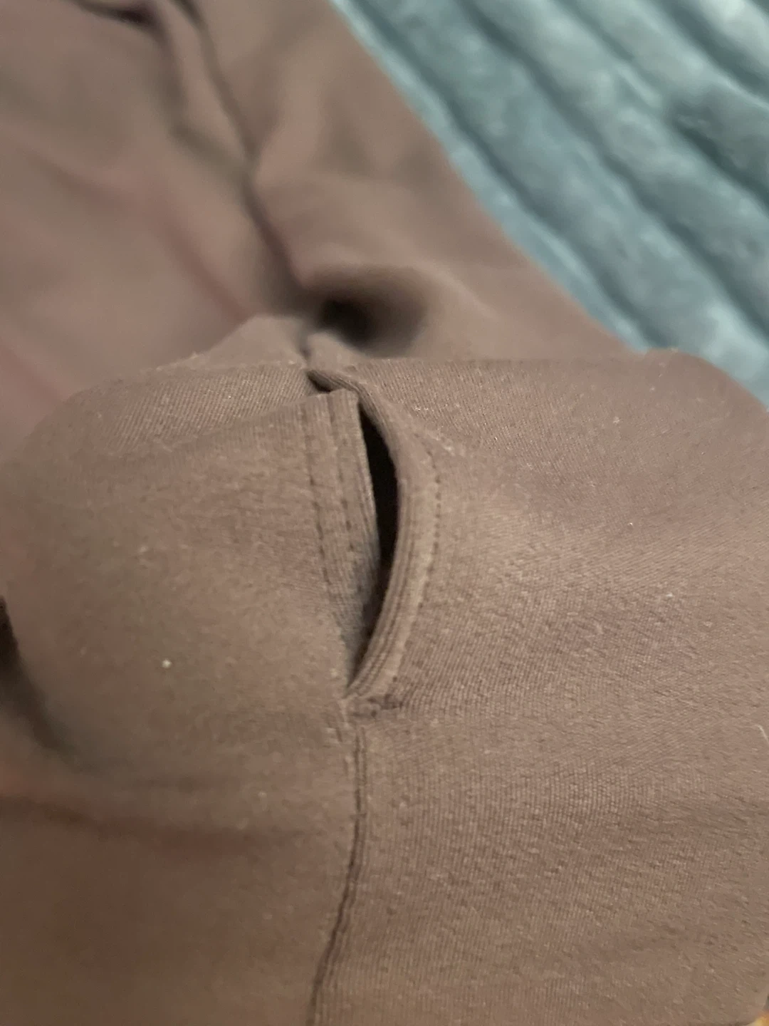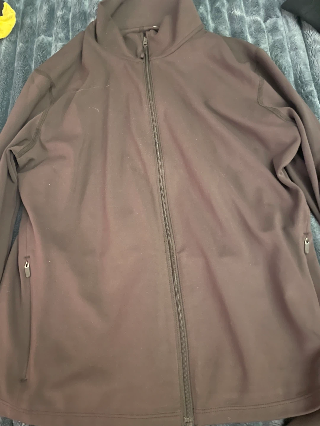 This is a brown full-zip jacket. It appears to be in good condition and ready for a new owner! It has a high neck and thumb holes.