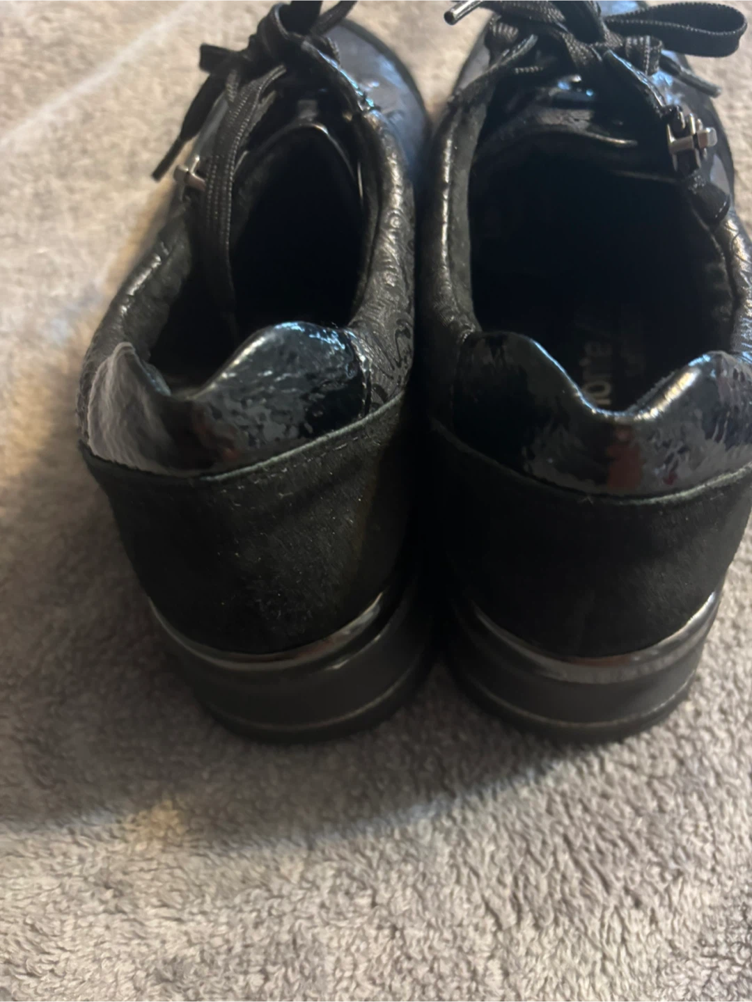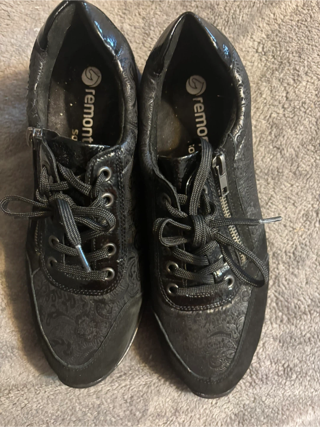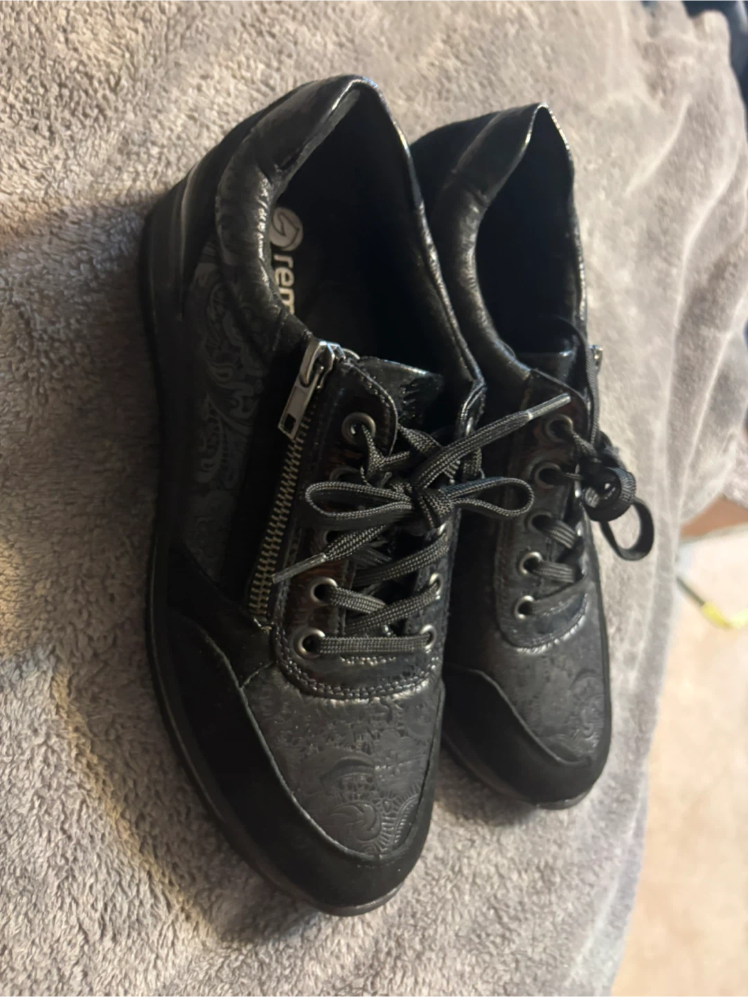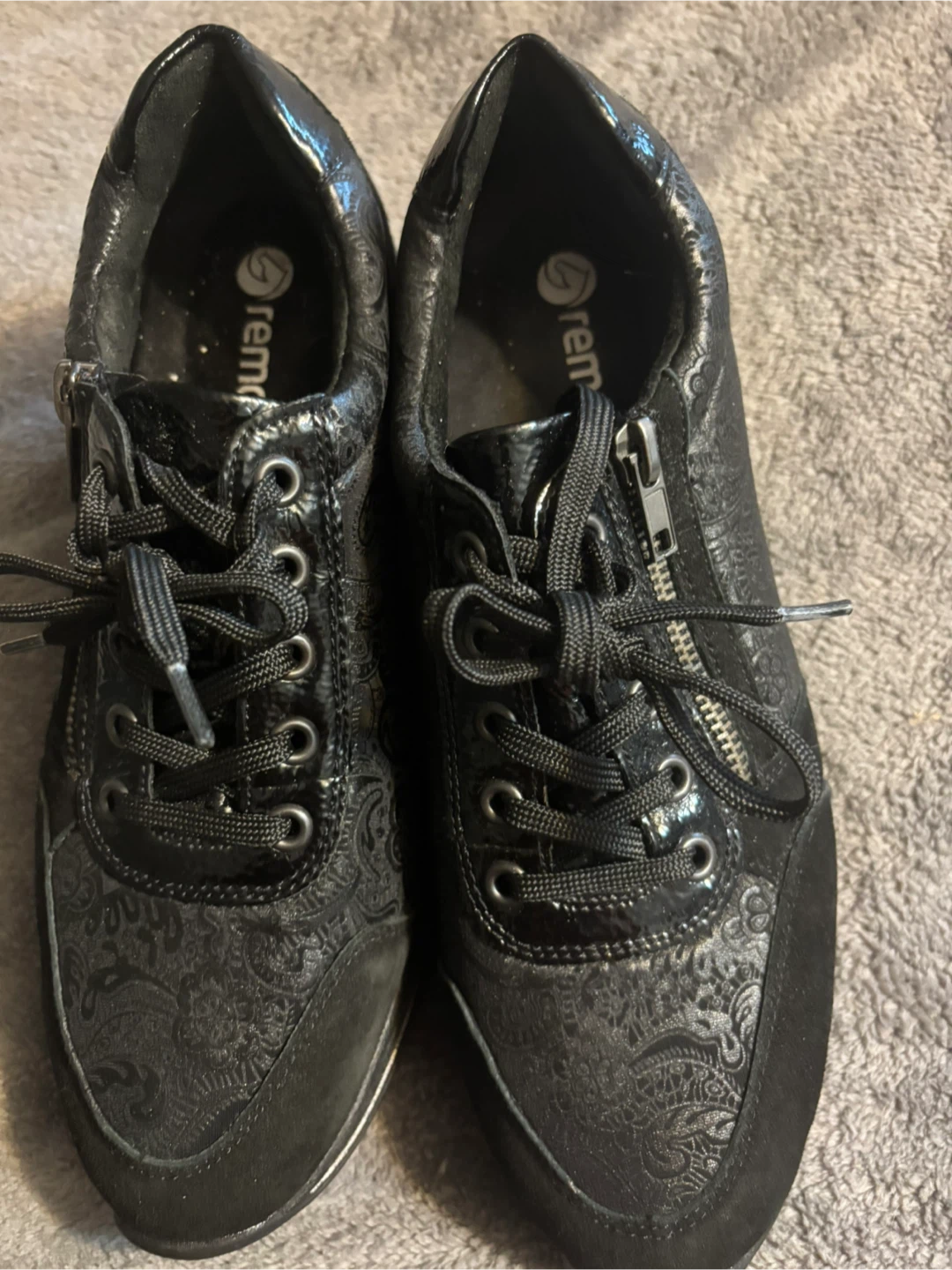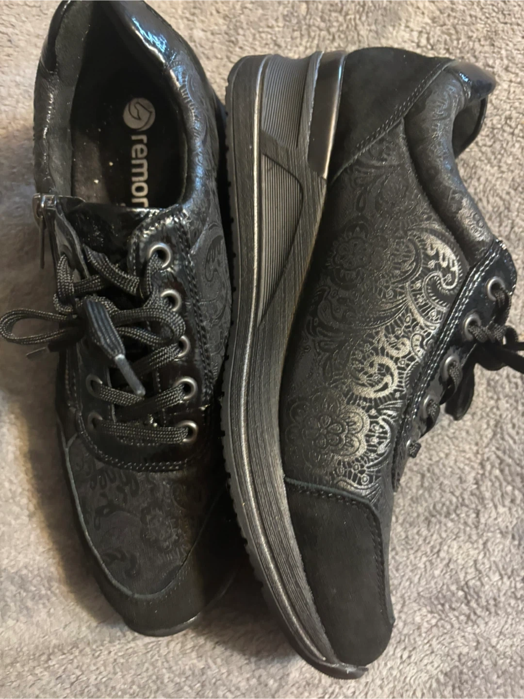 Remonte D3203 black fashion sneakers featuring an all-over paisley print and a side zipper closure.