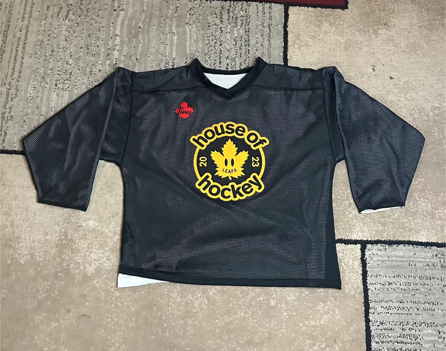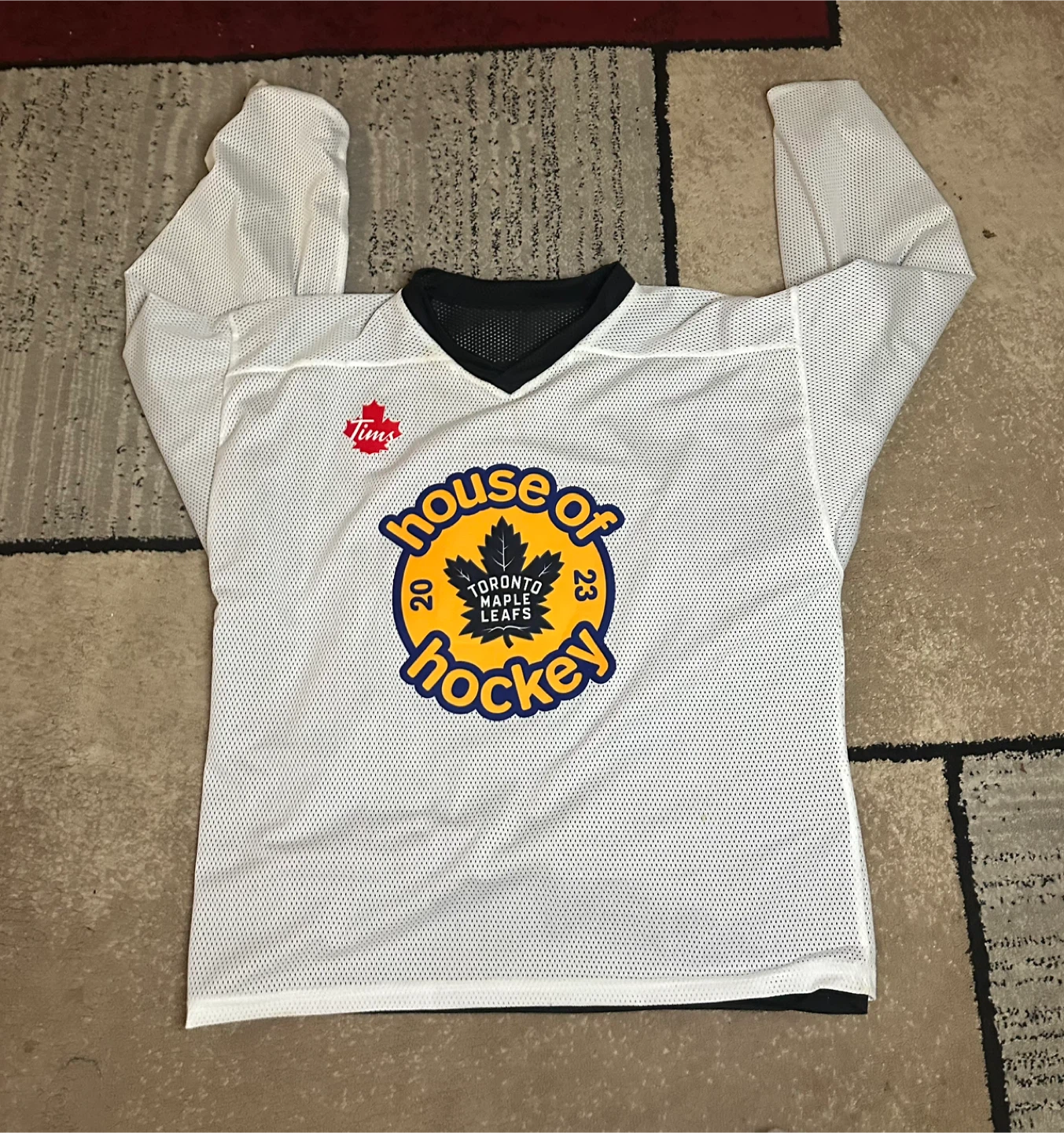 Selling A Toronto Maple Leafs House of Hockey youth practice jersey. Reversible black/white, Medium , good condition. Great for hockey, everyday wear, or Leafs fans.