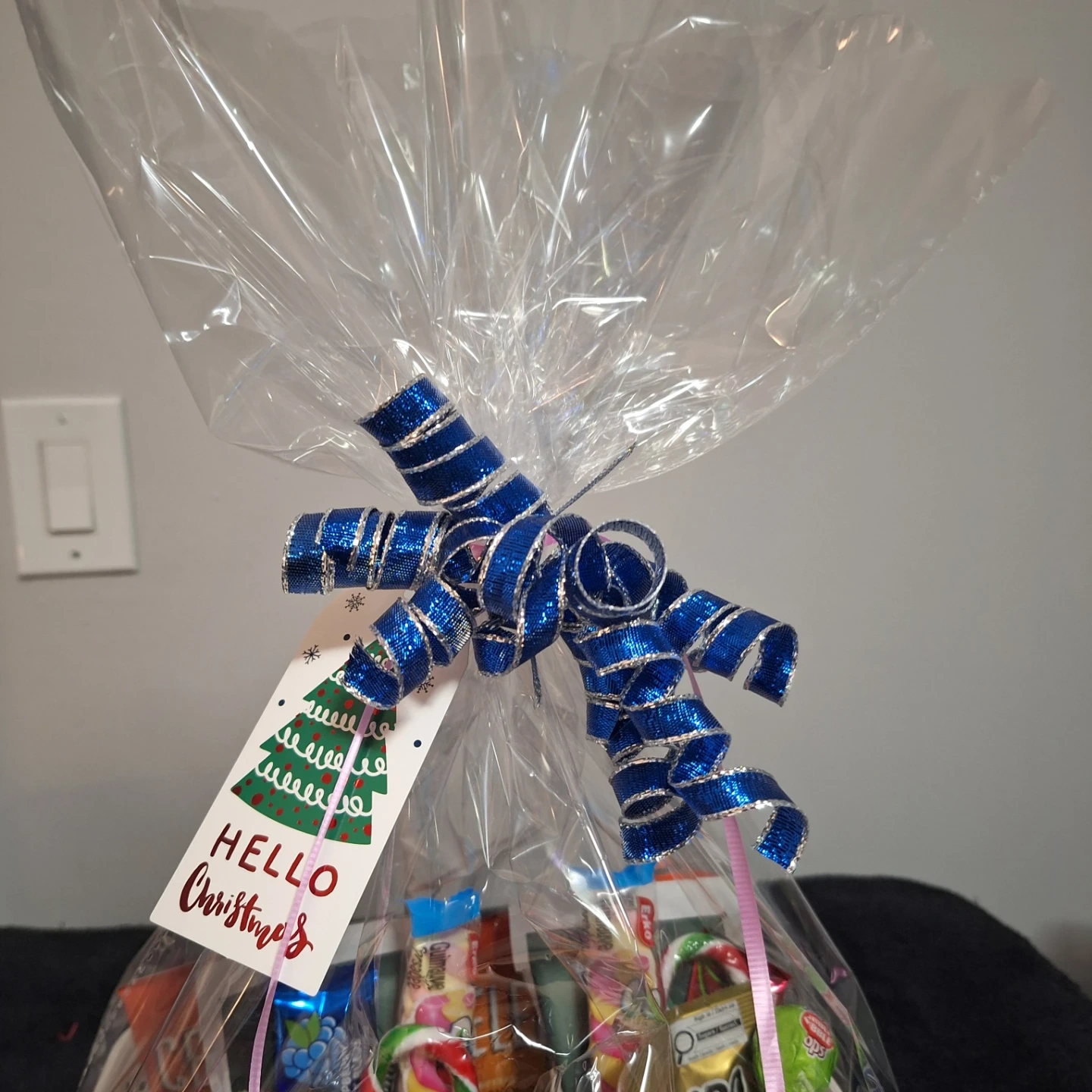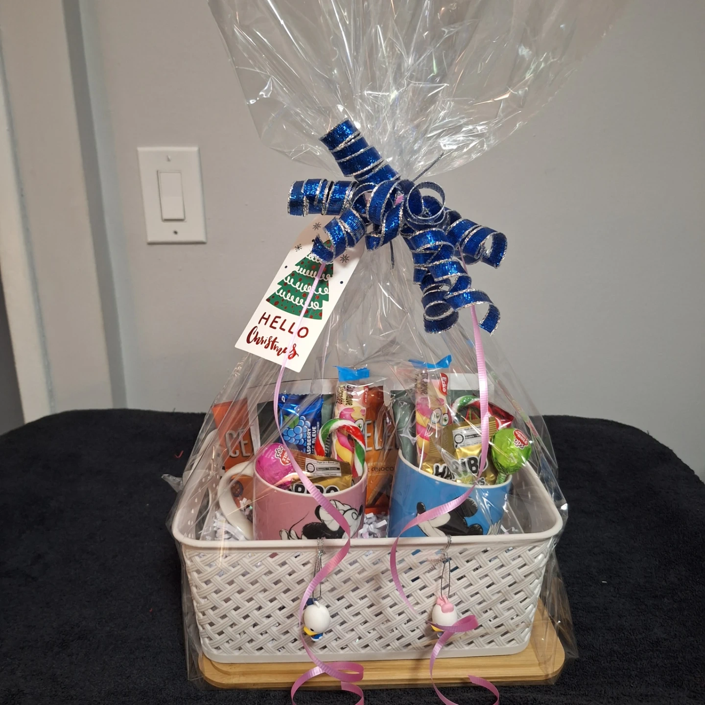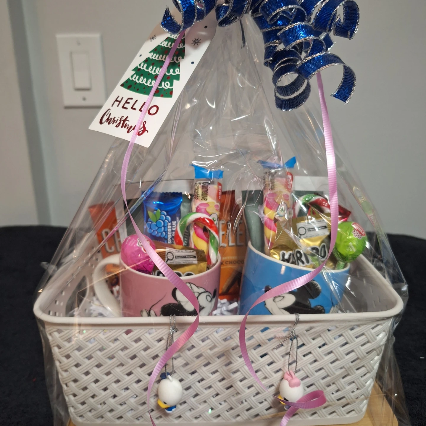 Selling a cute Christmas gift basket! It includes two Disney mugs (Mickey and Minnie), assorted candies, and a festive bow. Perfect as a holiday gift!