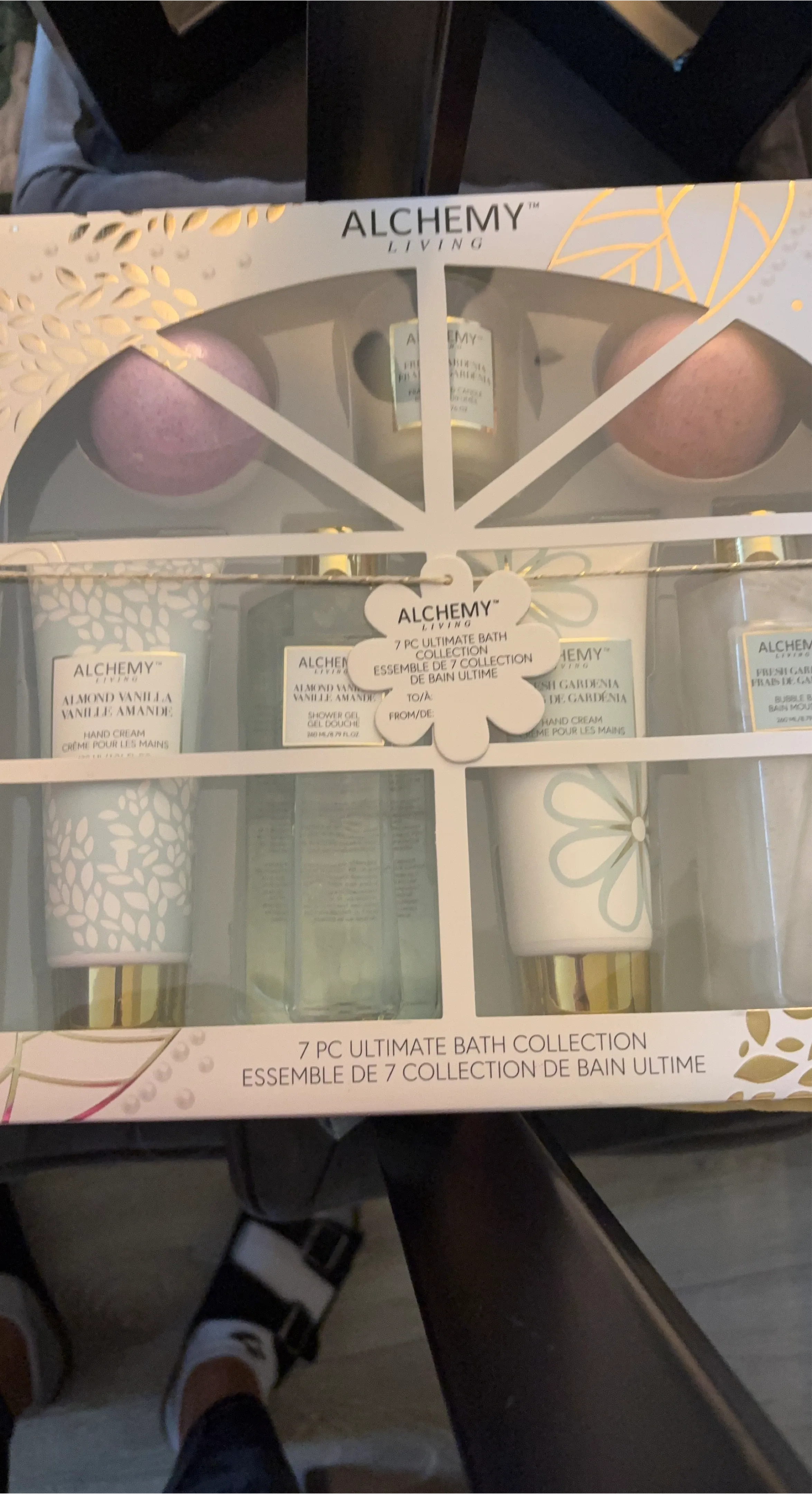 Selling an Alchemy Living 7-piece ultimate bath collection! It includes hand cream, shower gel, and bubble bath in almond vanilla and fresh gardenia scents. Perfect for a relaxing spa day at home