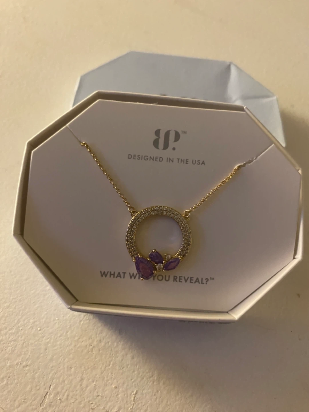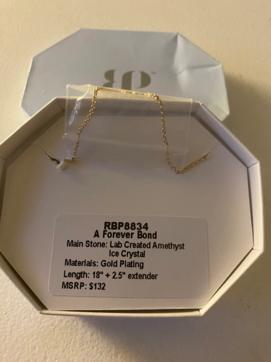 This is a lovely Forever Bond necklace designed in the USA! It features a lab-created amethyst ice crystal as its main stone, set in gold plating. The chain length is 18" with a 2.5" extender. it comes with the box