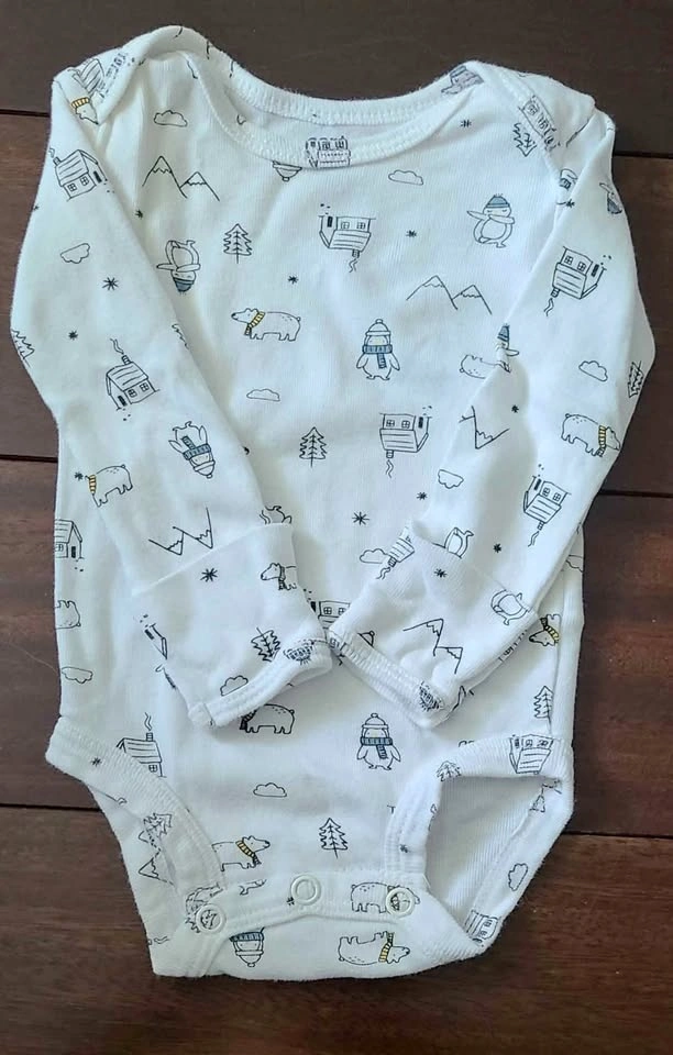 A cute white Carter's onesie with a winter-themed print! Features polar bears, penguins, mountains, and little cabins. Perfect for keeping your little newborn cozy!