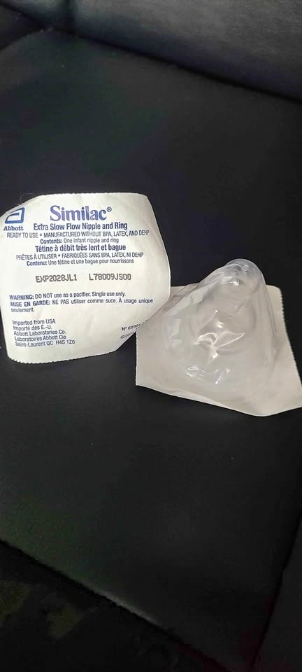 I'm offering Similac Extra Slow Flow Nipples and Rings, brand new and ready to use! They are individually wrapped for hygiene. The packaging indicates an expiry date of 2028 July 01, so they're fresh and safe for your little one. 2 for $4