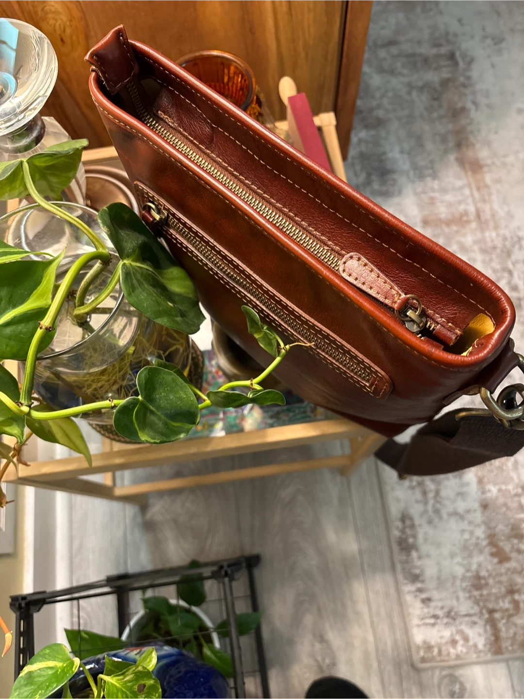 Selling a lovely brown leather crossbody bag! It's in great condition and perfect for everyday use. The bag features a zipper and a long adjustable strap. It's a stylish and practical accessory to keep your essentials organized
