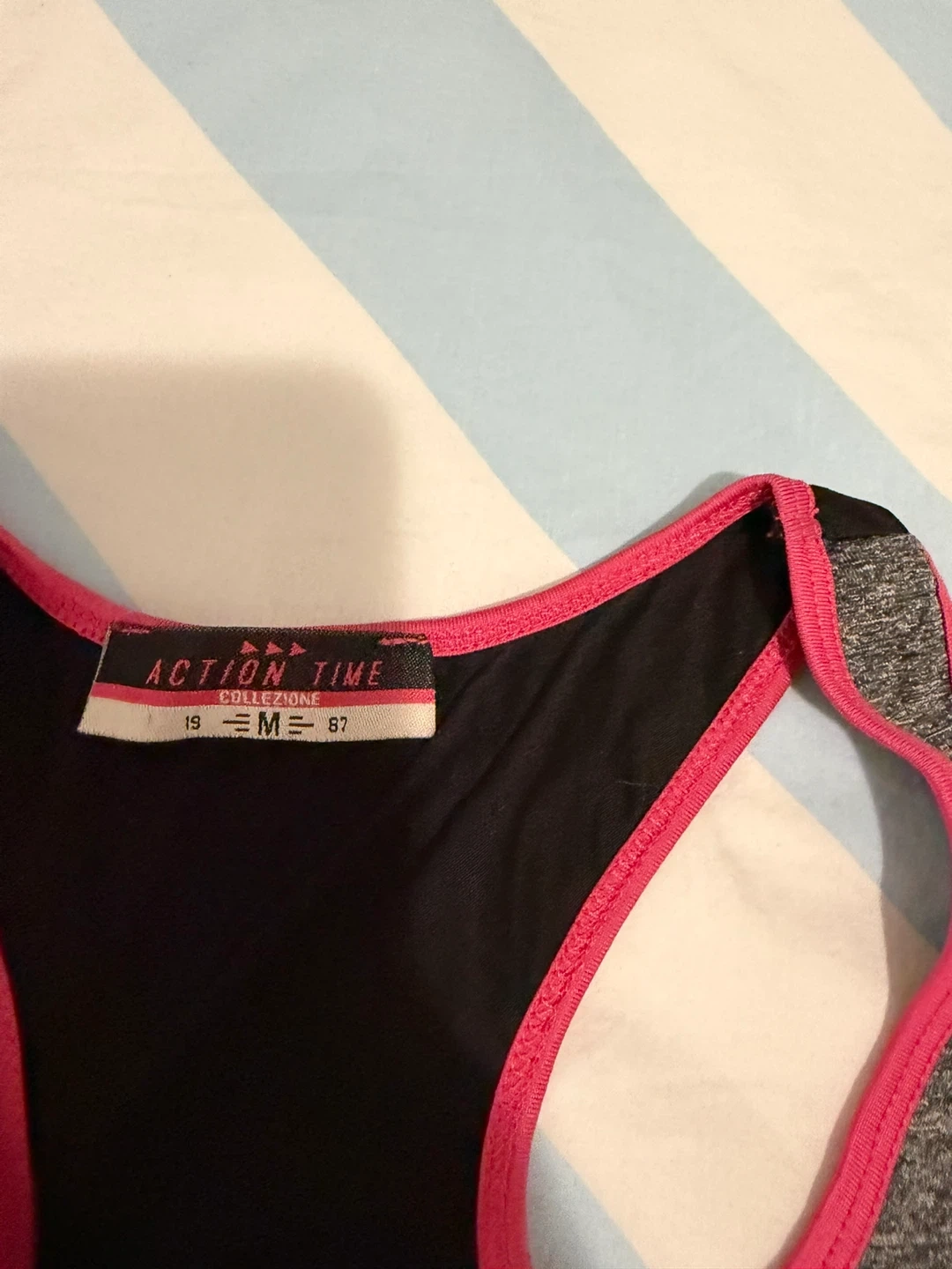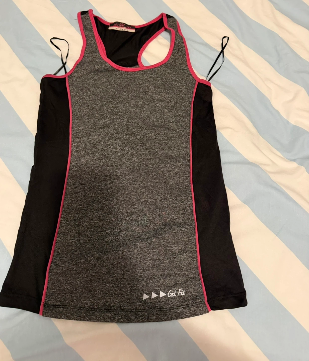 Selling a gently used Action Time athletic tank top! It's a size medium and features a stylish design with a grey body, black side panels, and vibrant pink trim. The 'Get Fit' logo is on the front. Perfect for workouts or casual wear!
