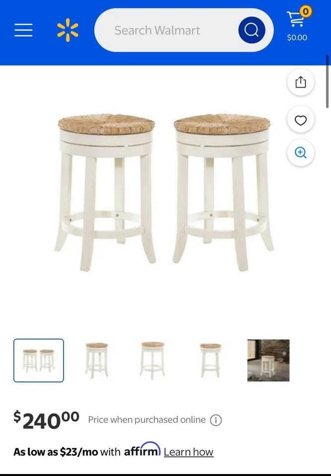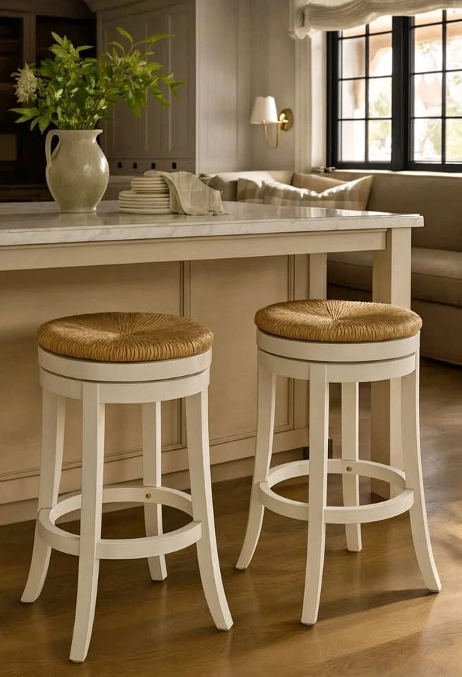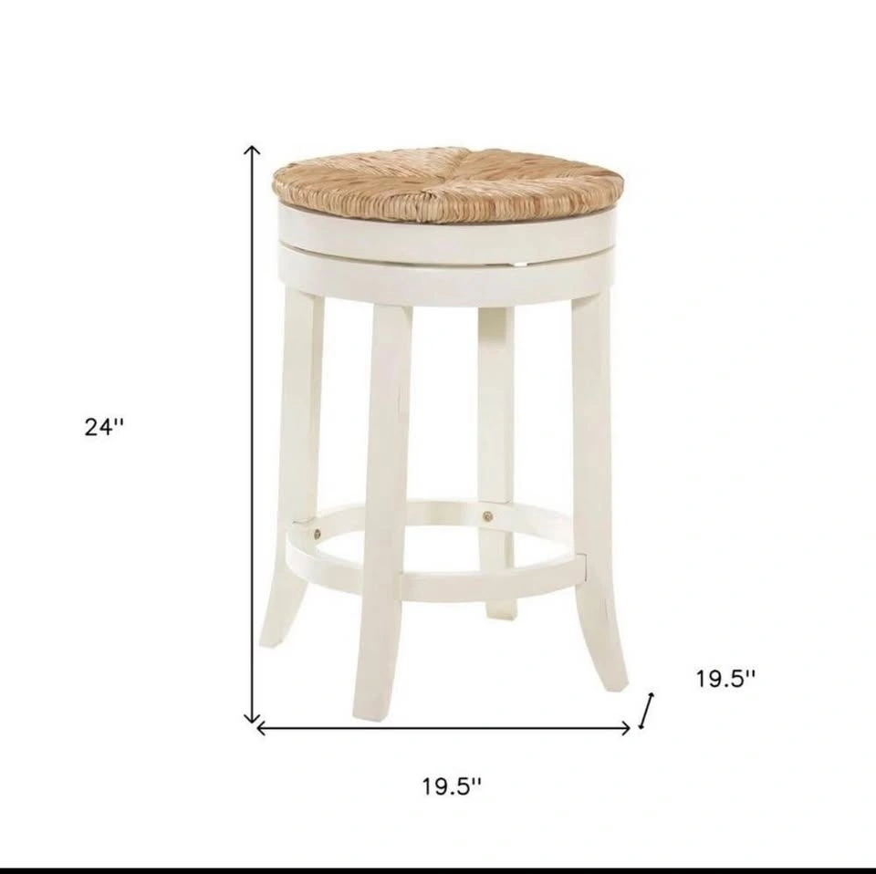 Beautiful counter-height swivel stools featuring natural-fibre rush seats and a solid wood frame in antique white. Brand new in box. Price is for the pair.
