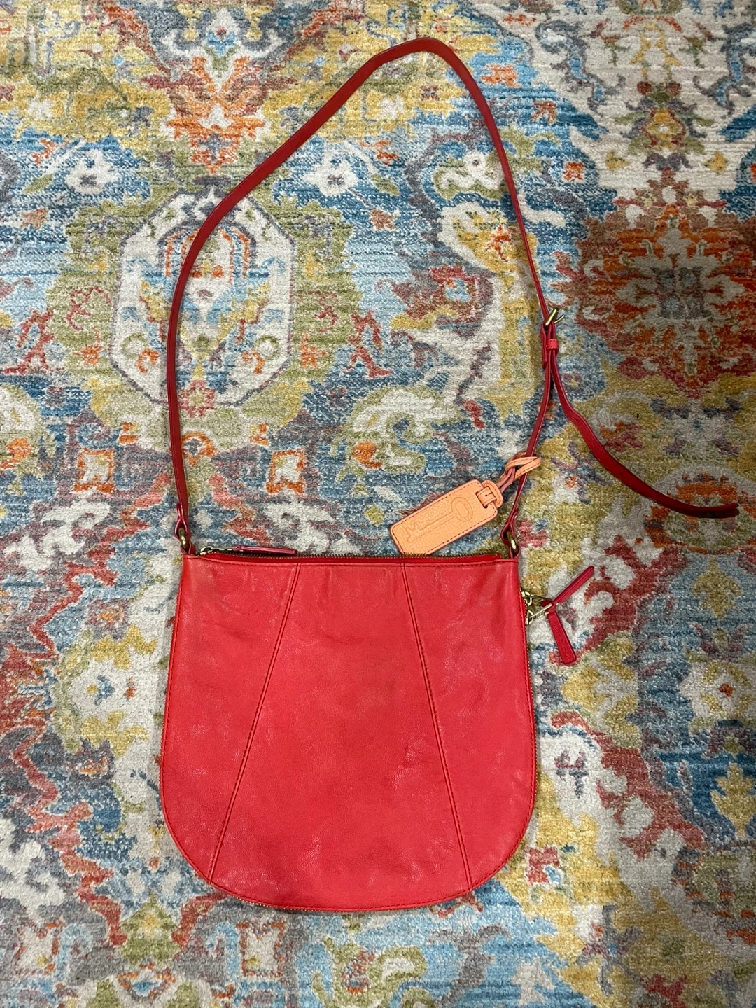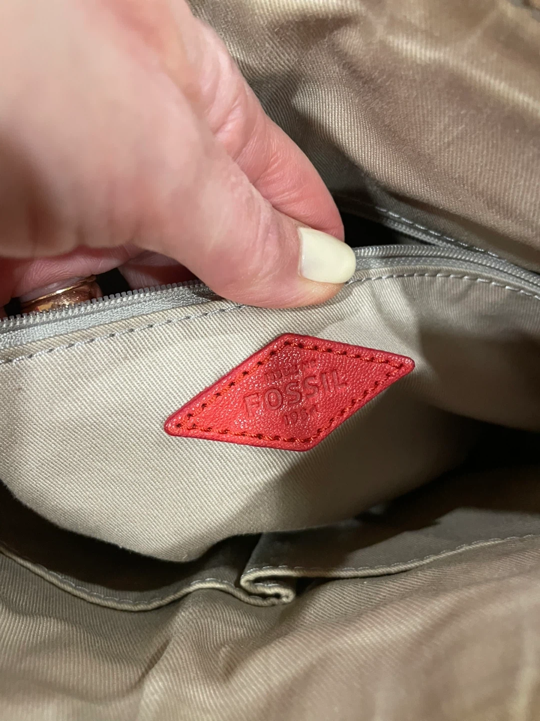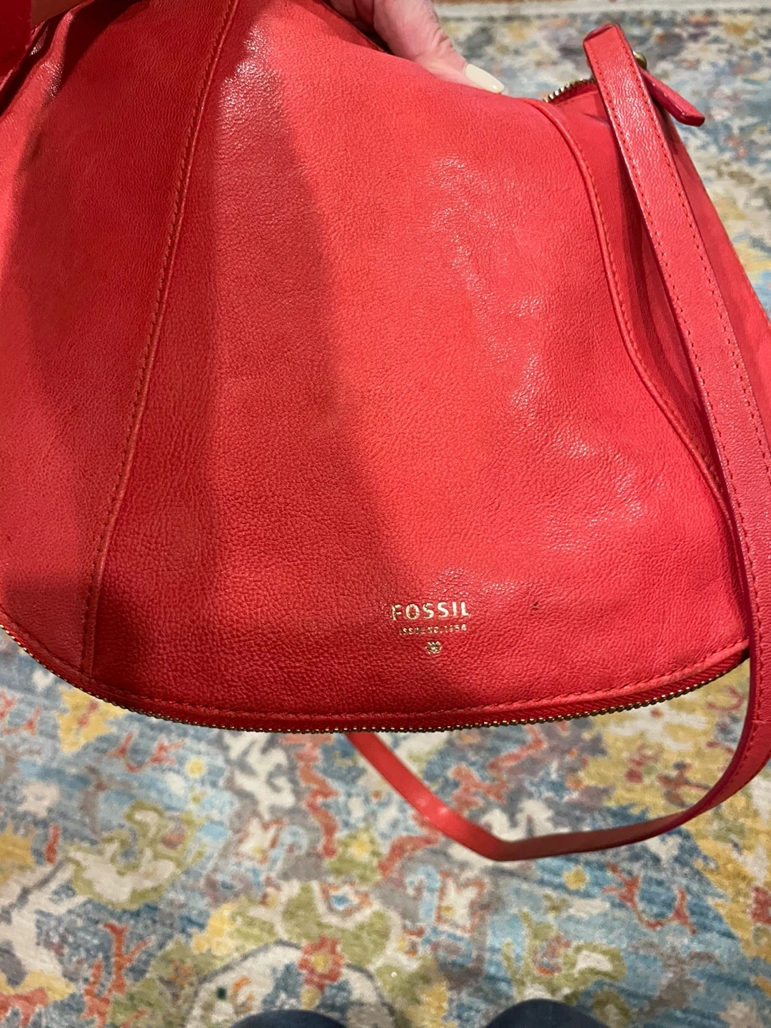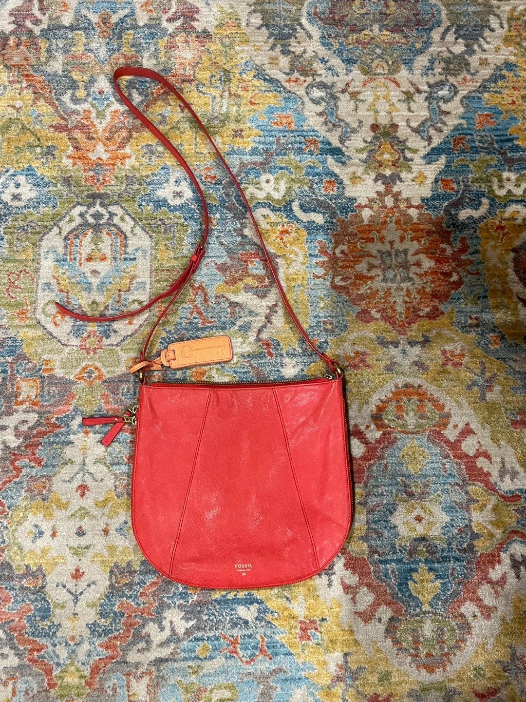 Here's a stylish red leather crossbody bag from Fossil! It's in great condition and ready for a new owner. Perfect for carrying your essentials while keeping your hands free