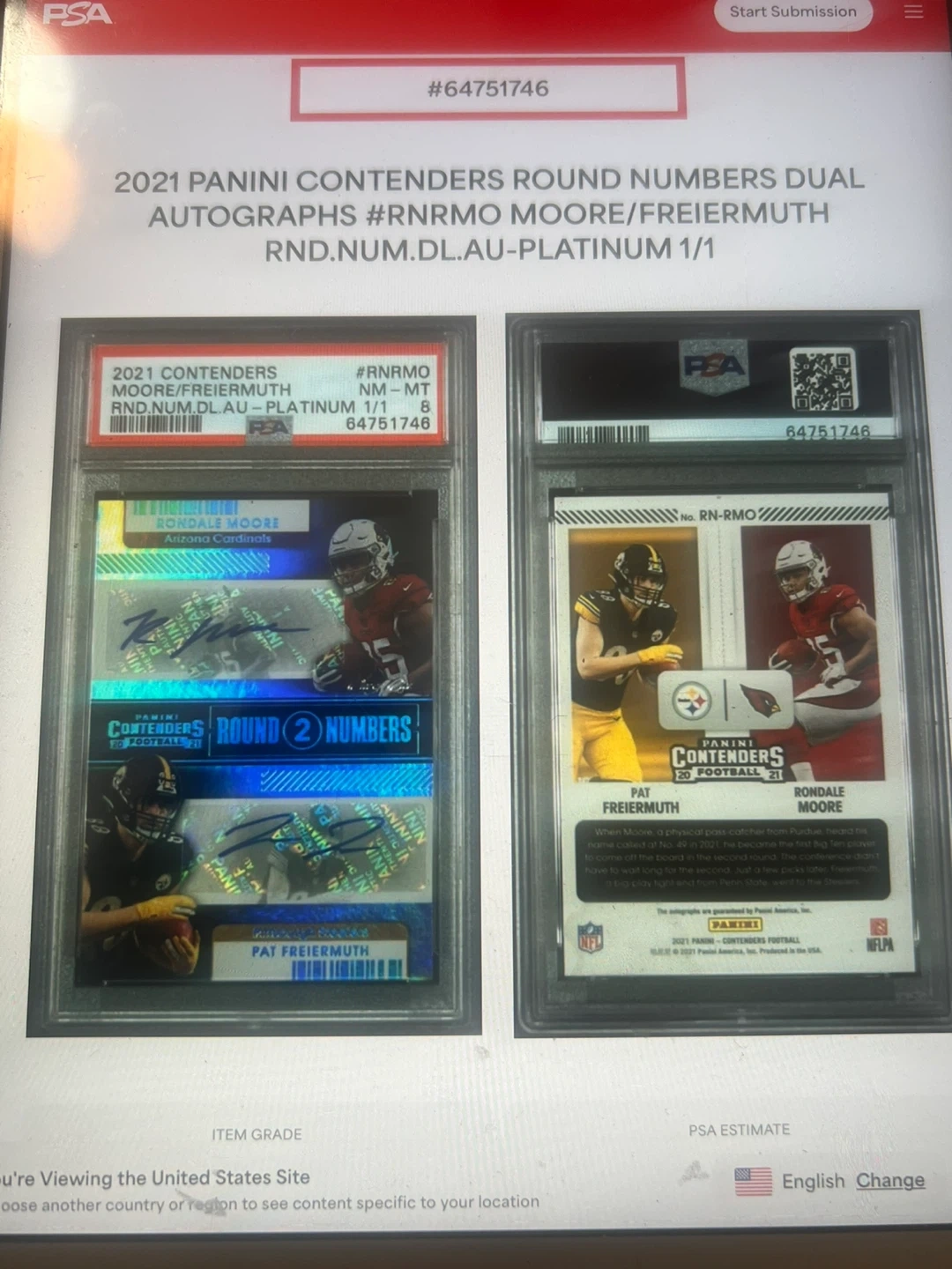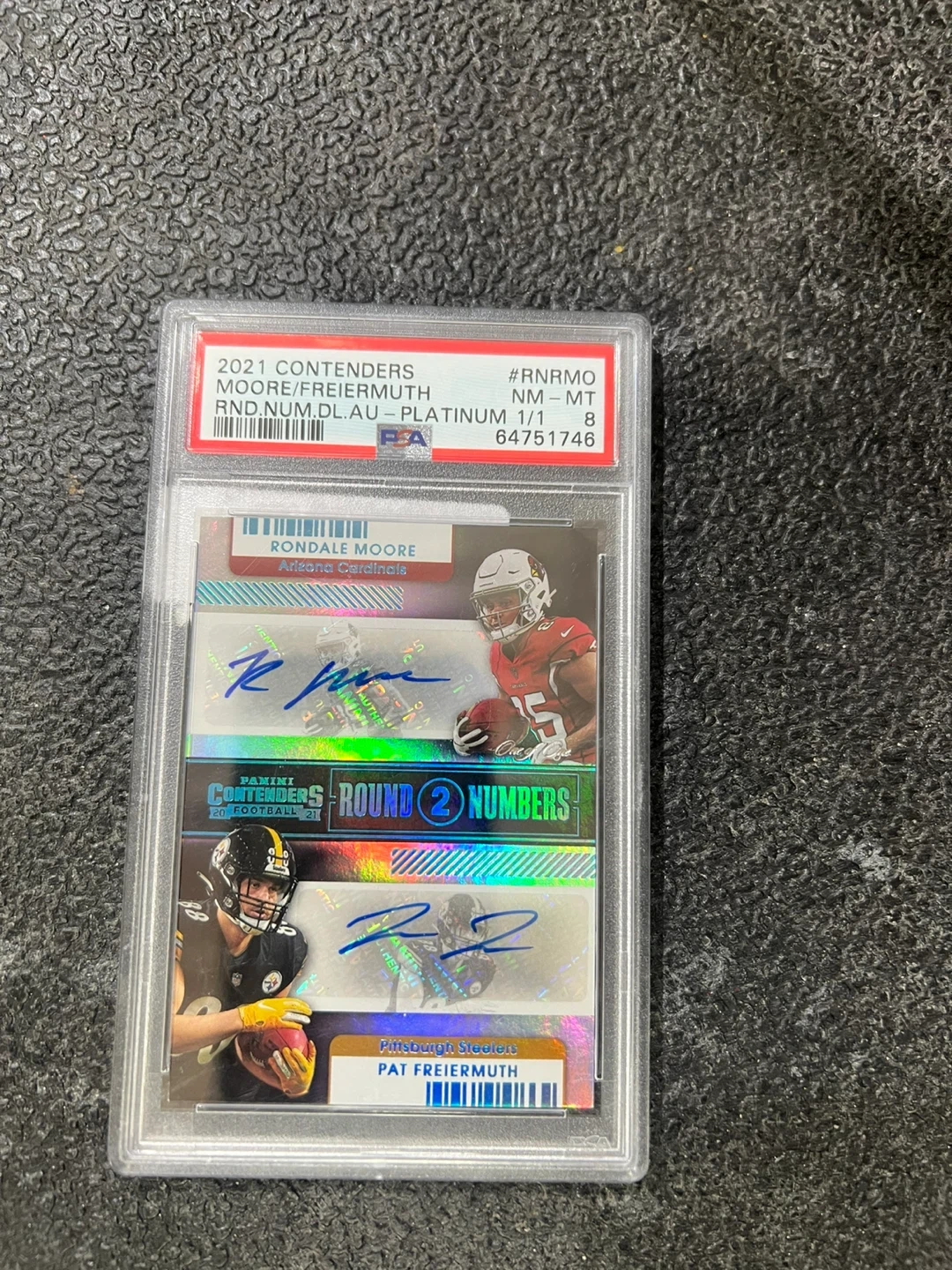 Selling a 2021 Panini Contenders Round Numbers Dual Autographs card featuring Rondale Moore and Pat Freiermuth. This is a platinum 1/1 card. A great addition to any sports memorabilia collection!