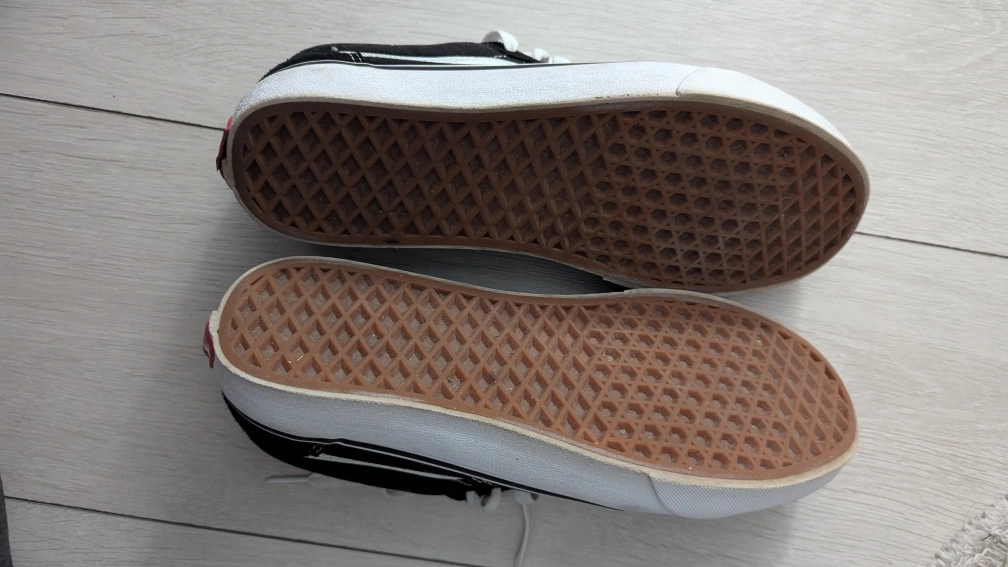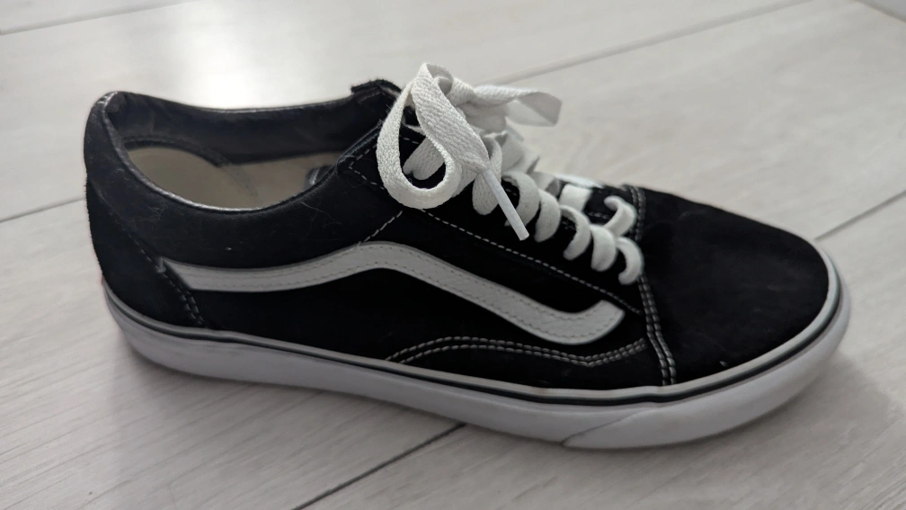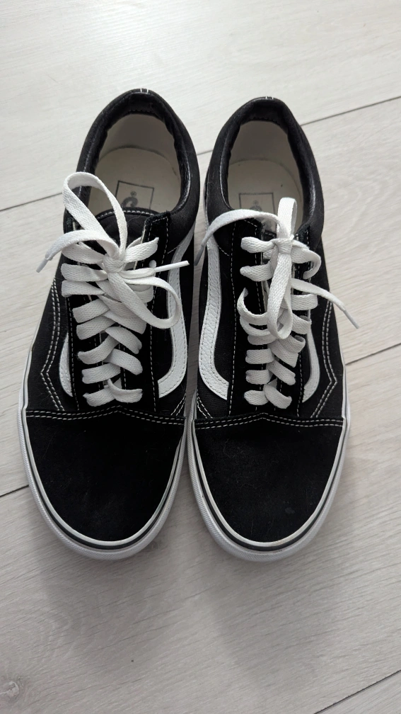 Selling a pair of Vans Old Skool sneakers in black and white. They're in good used condition and are a men's size 9 (US). Classic and versatile style!