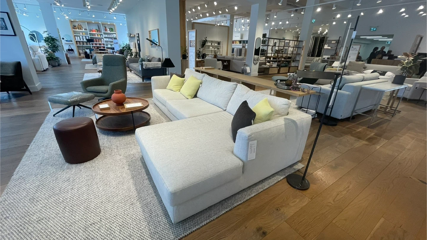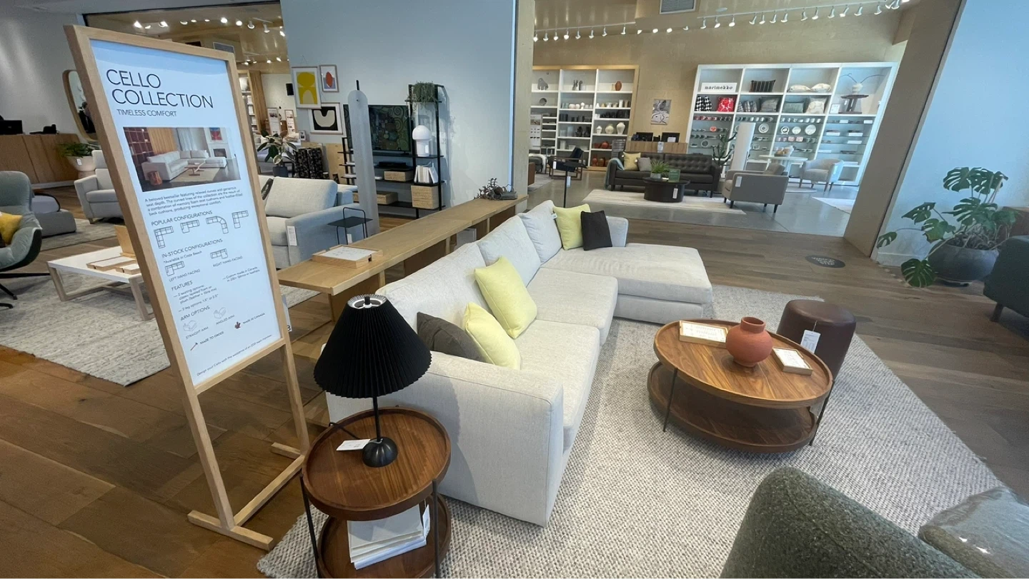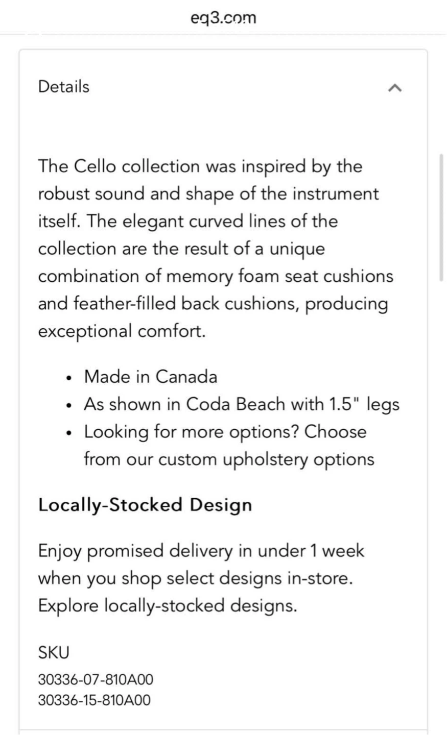 • 2-piece Cello sectional (left-hand facing chaise) currently is still on display at the EQ3 store on south Granville Total current Retail value at the store: $6,598 + tax