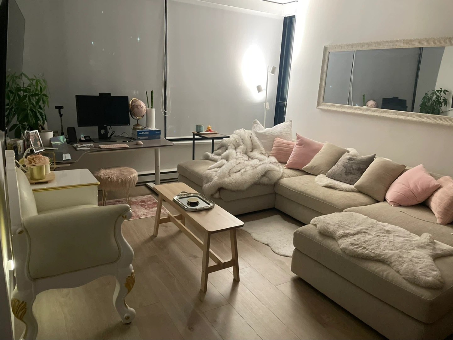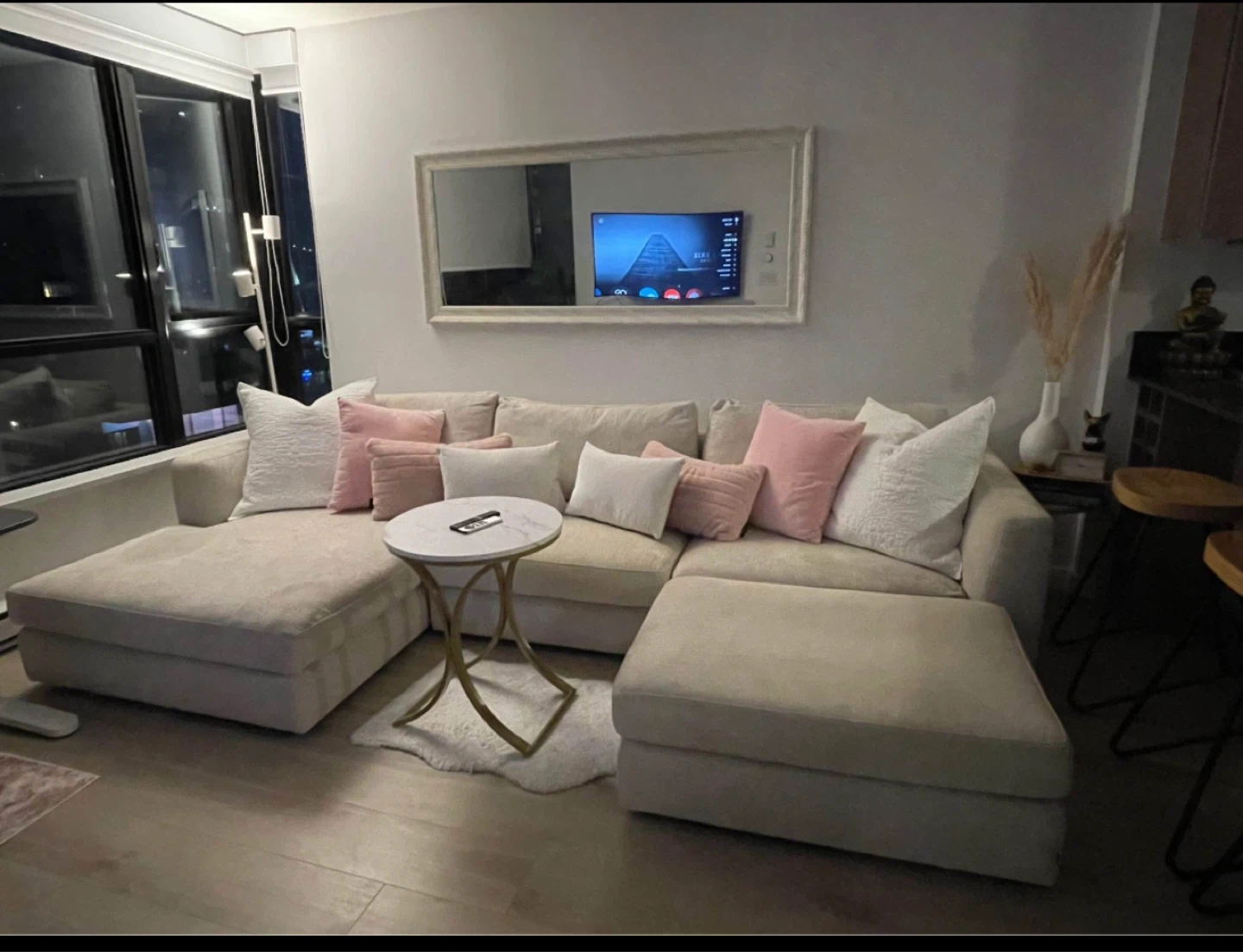 Selling my beautiful EQ3 Cello 2-piece sectional with left-hand facing chaise and matching ottoman, upholstered in the premium Coda Bleach fabric (Grade F). This is a Canadian-made designer set with memory foam seating and feather-filled back cushions for exceptional comfort and support.