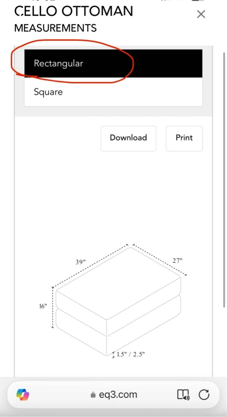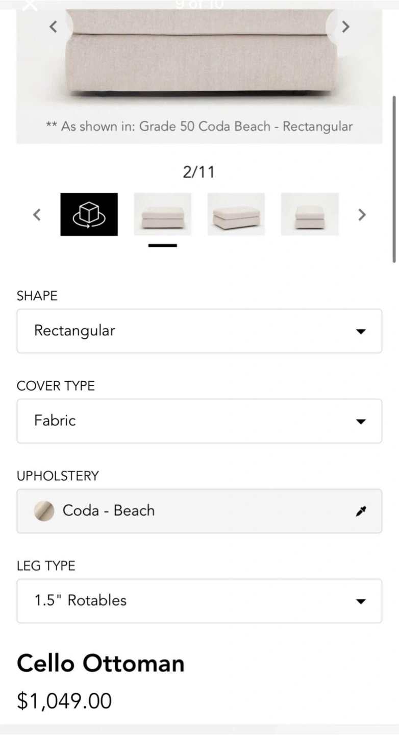 • Matching rectangular Cello ottoman —retails separately for $1049 (no storage)