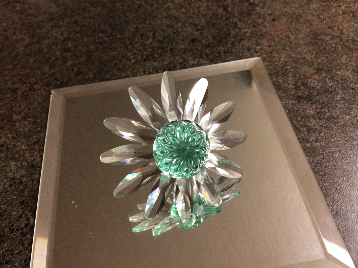Selling a beautiful crystal flower figurine. It's a lovely piece for home decor and would look great on a shelf or table. The flower has clear petals and a green centre, making it a unique and eye-catching item