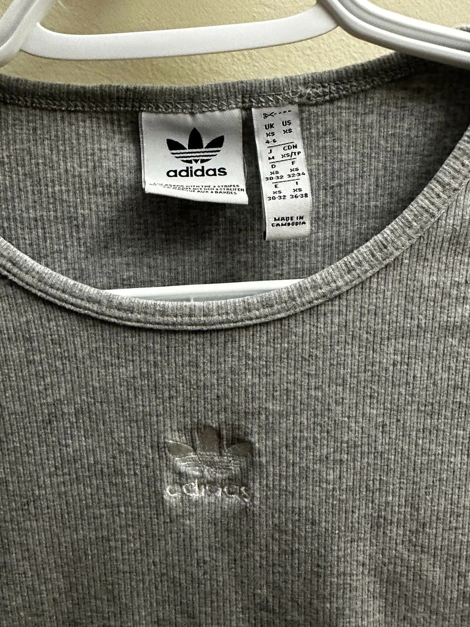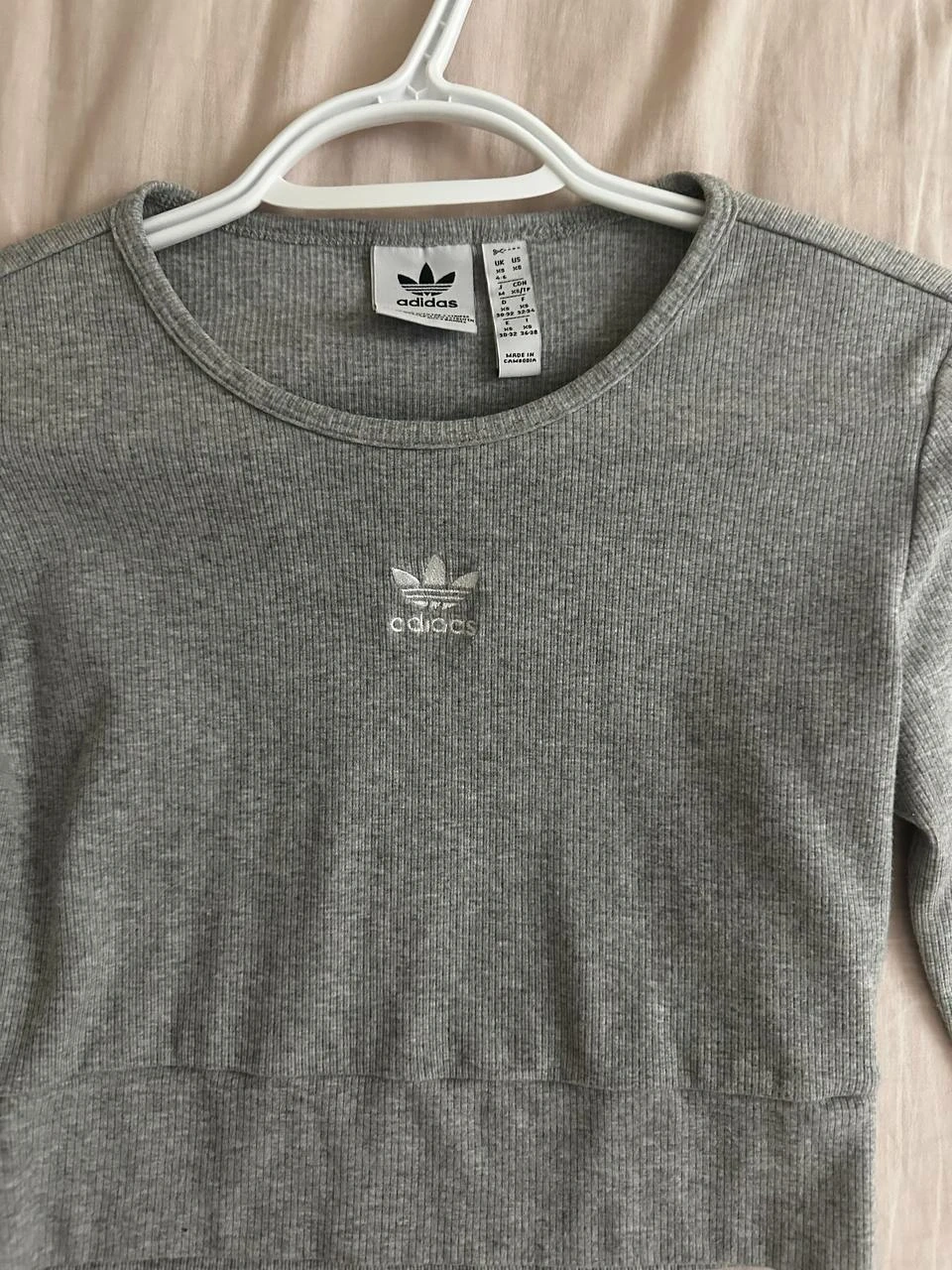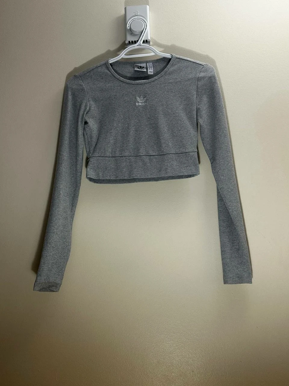Selling an Adidas long sleeve crop top in size XS. It's a nice grey colour and in great condition! Perfect for layering or wearing on its own! It would also be a super trendy gift for Christmas🎄🎄🎊!!!