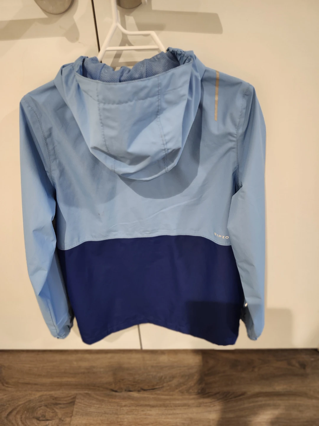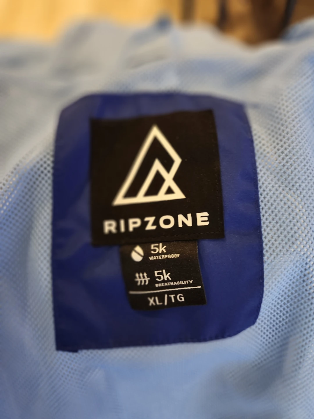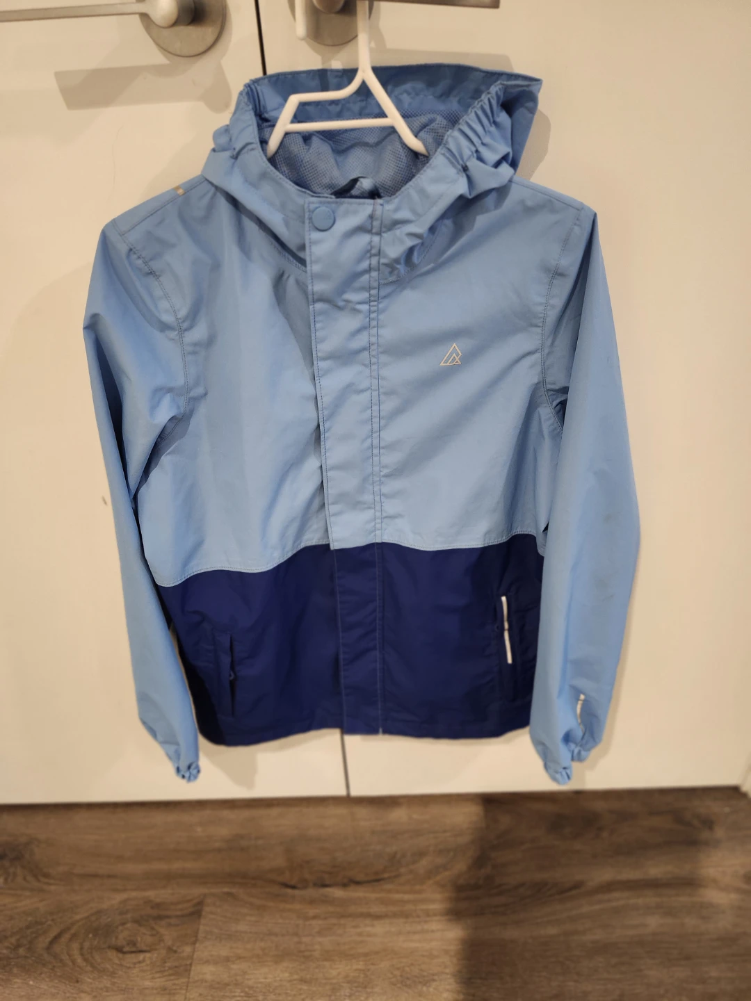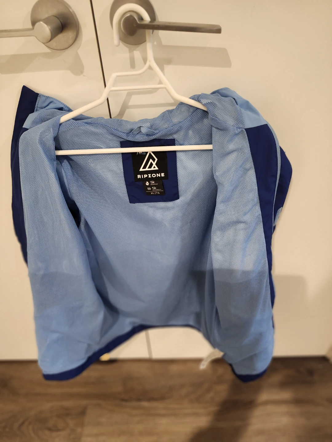 Selling a Ripzone rain jacket in size XL. Fits 13 years and up. Suitable for boys or girls. Two shades of blue. Waterproof and breathable. Mesh lined, zippered pockets, hooded. Perfect for those rainy days!