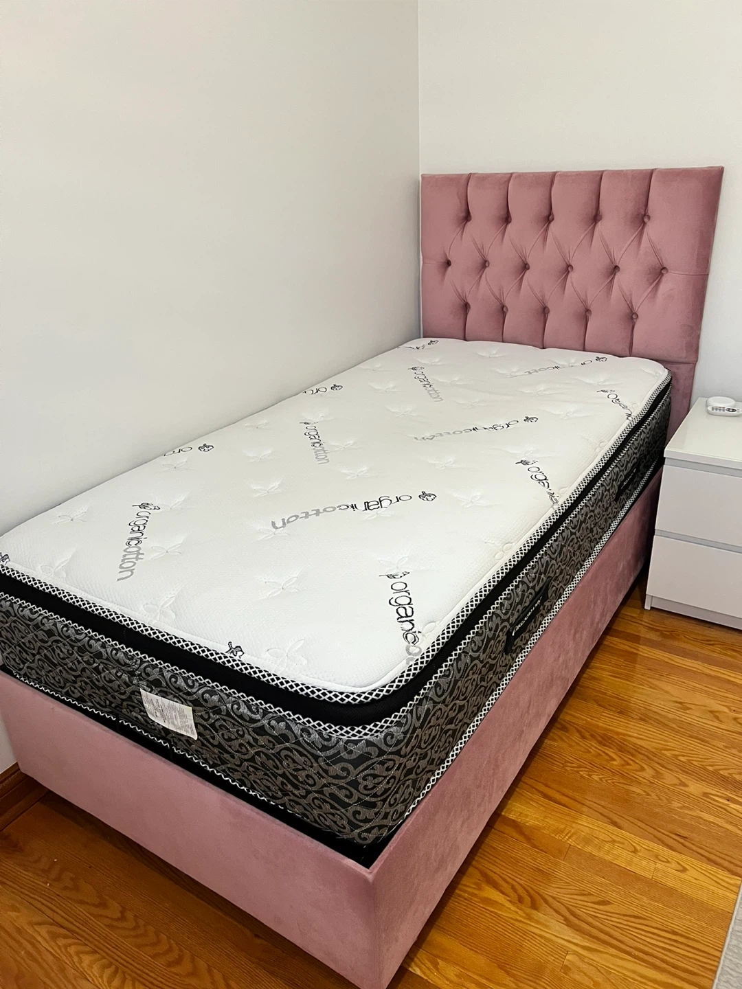 Selling a single bed with a lovely pink headboard. It's in great condition and would look perfect in any bedroom! The mattress is an Organic Cotton brand.