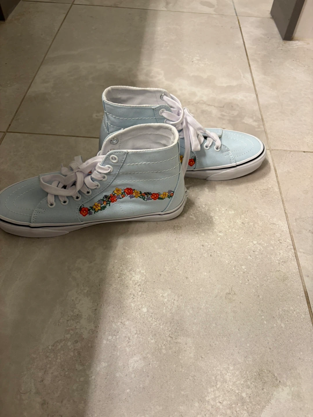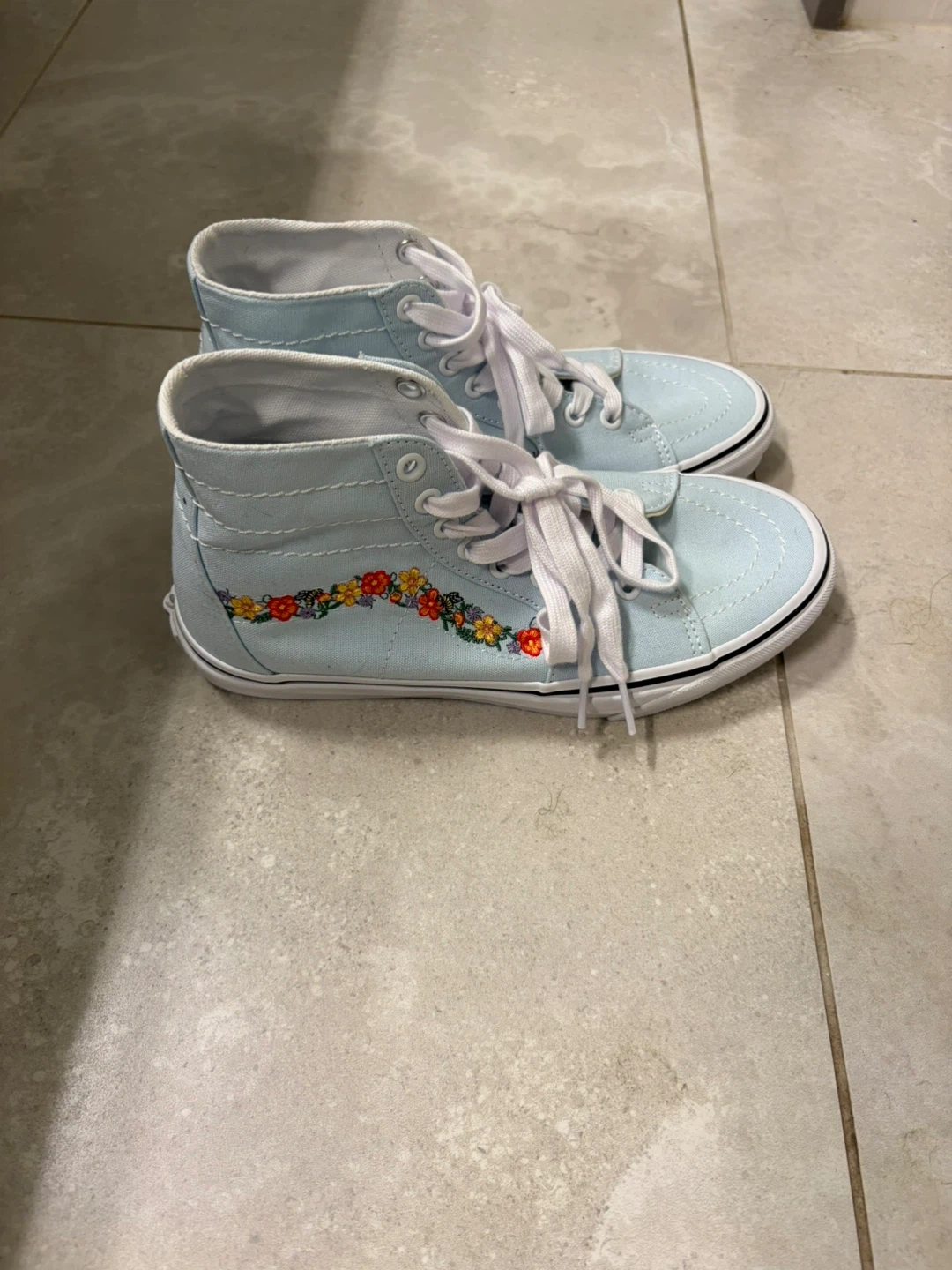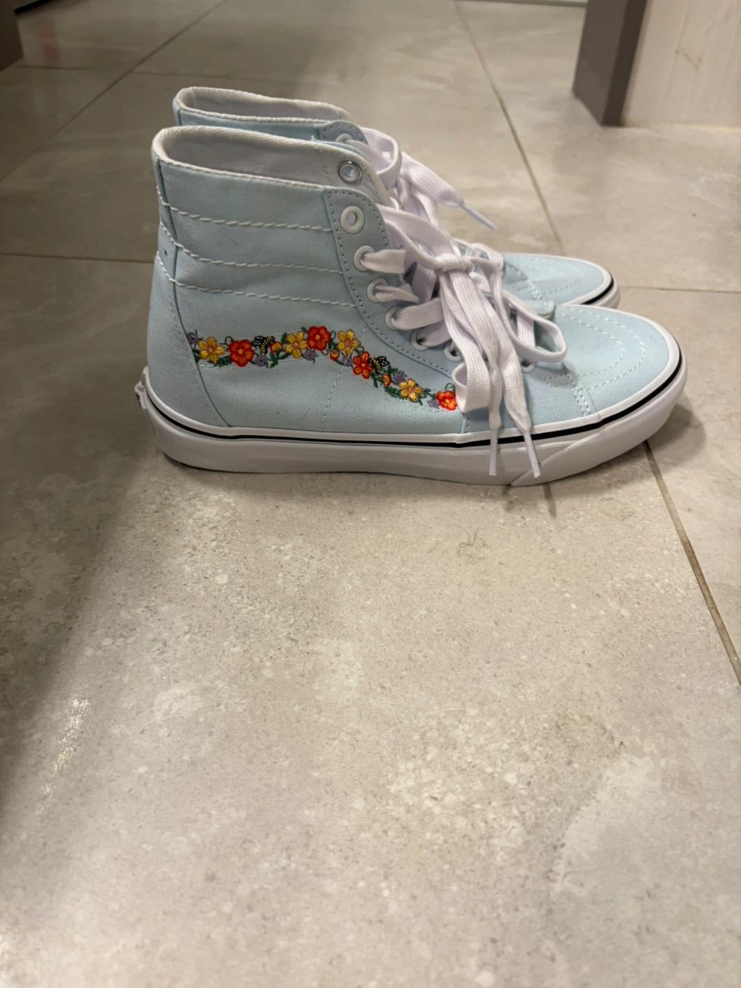 Selling a pair of Vans Sk8-Hi high tops in a lovely light blue colour! They feature a cute floral embroidery design along the side. These are in excellent condition