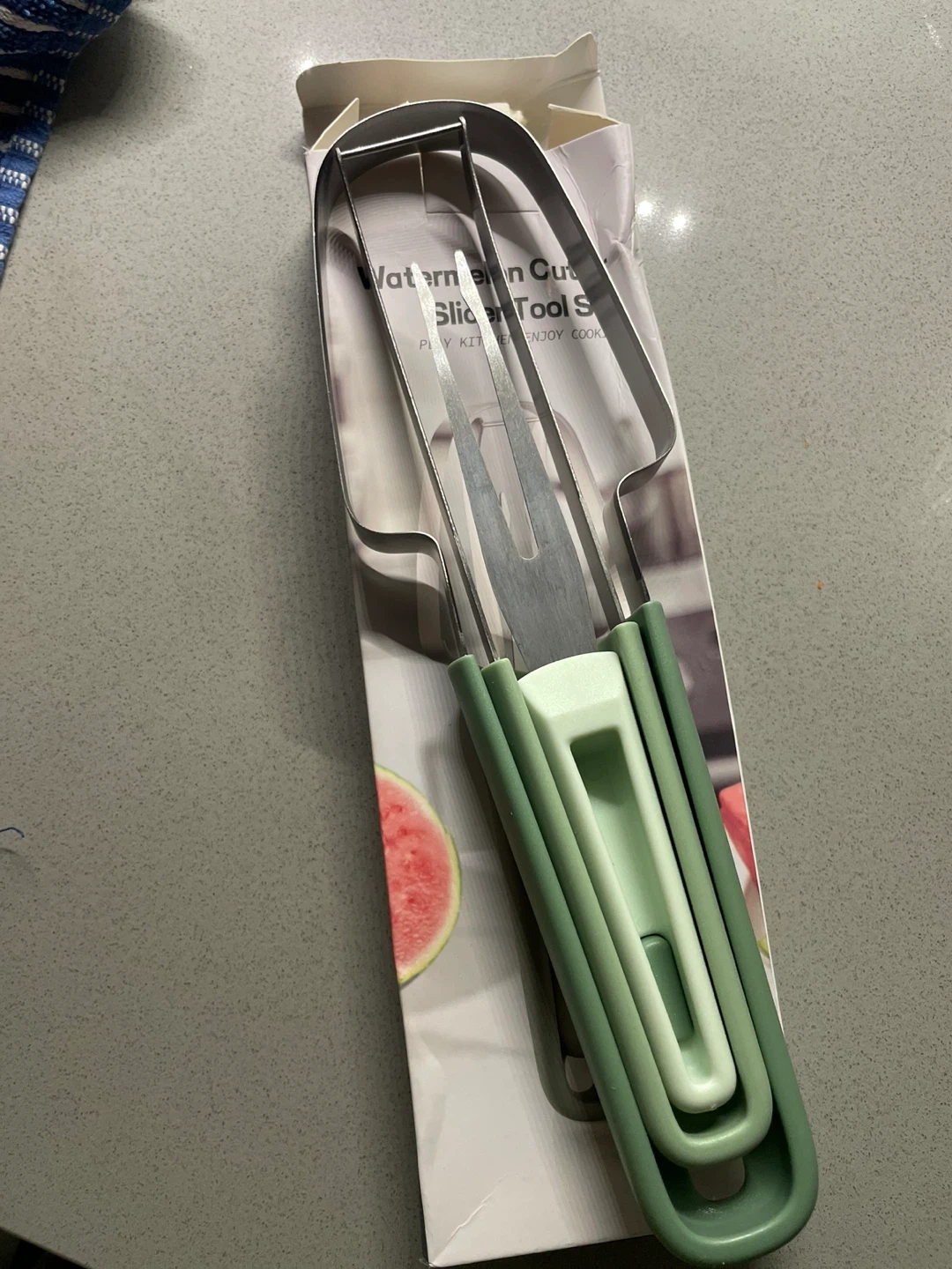 It's a 3-in-1 stainless steel tool that includes a watermelon knife, fork, and melon and fruit slicer
