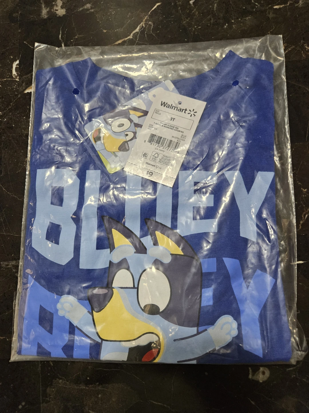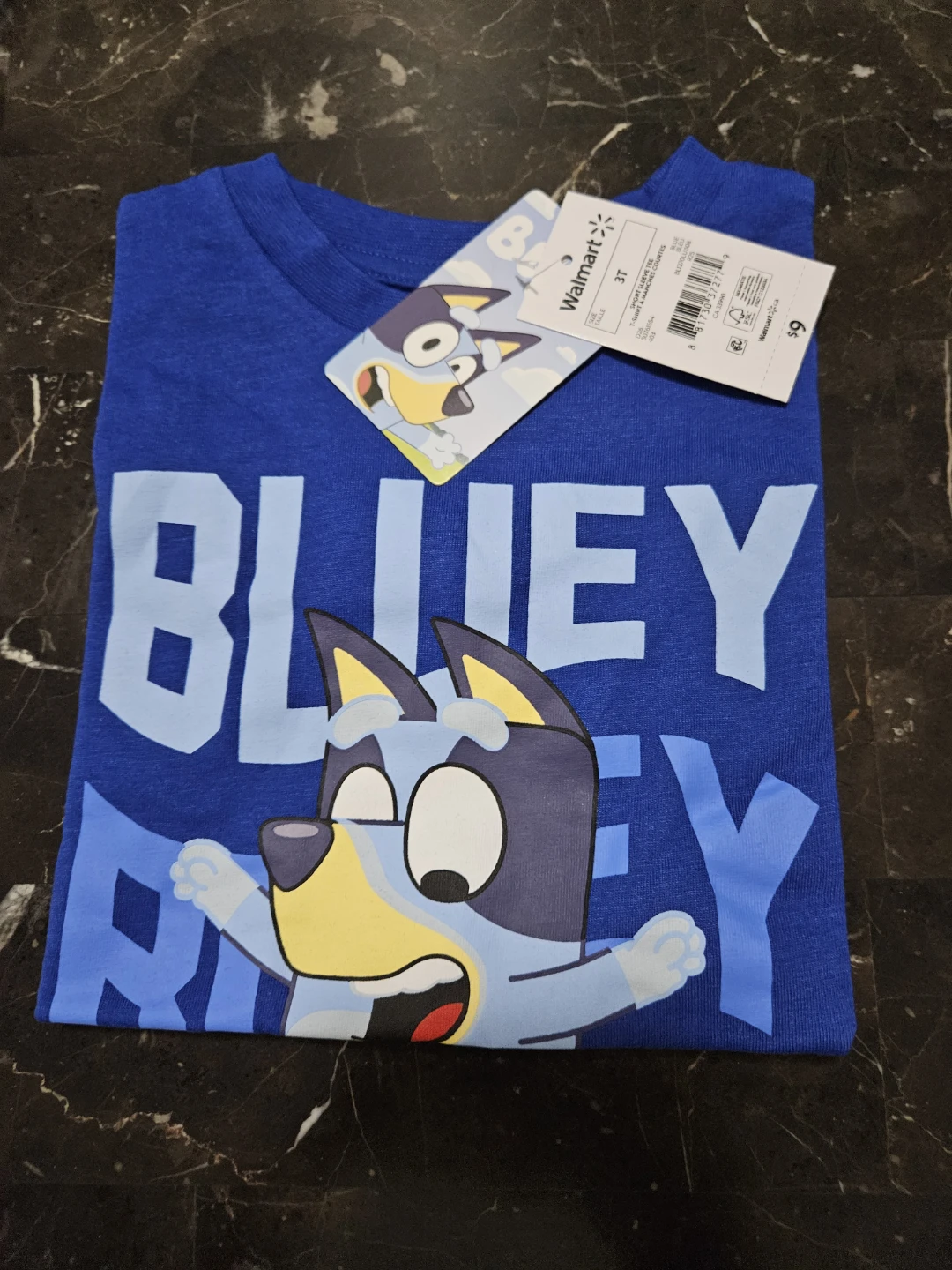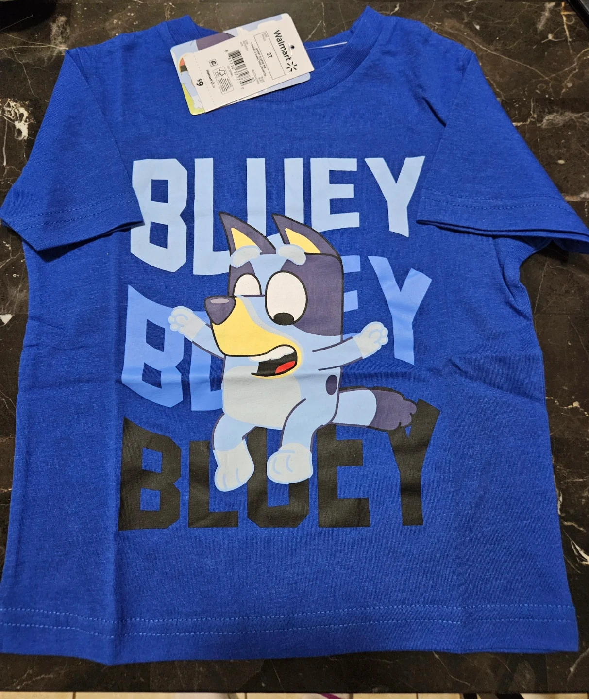 I'm selling a brand new Bluey t-shirt! It's a vibrant blue and features a fun Bluey design. The size is 3T and it still has the original tag from Walmart! Perfect for any Bluey fan