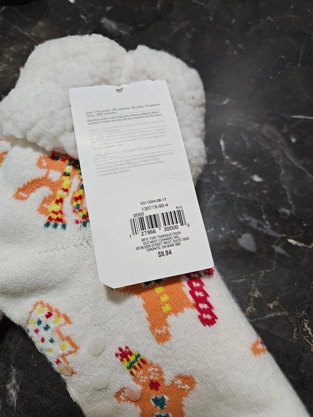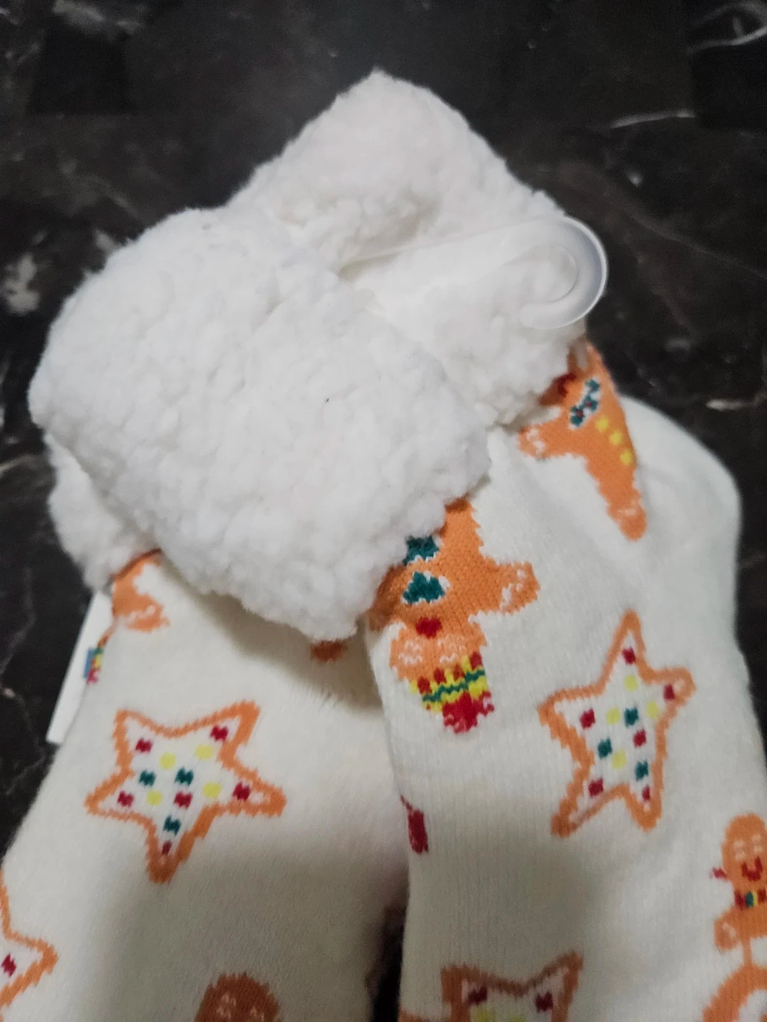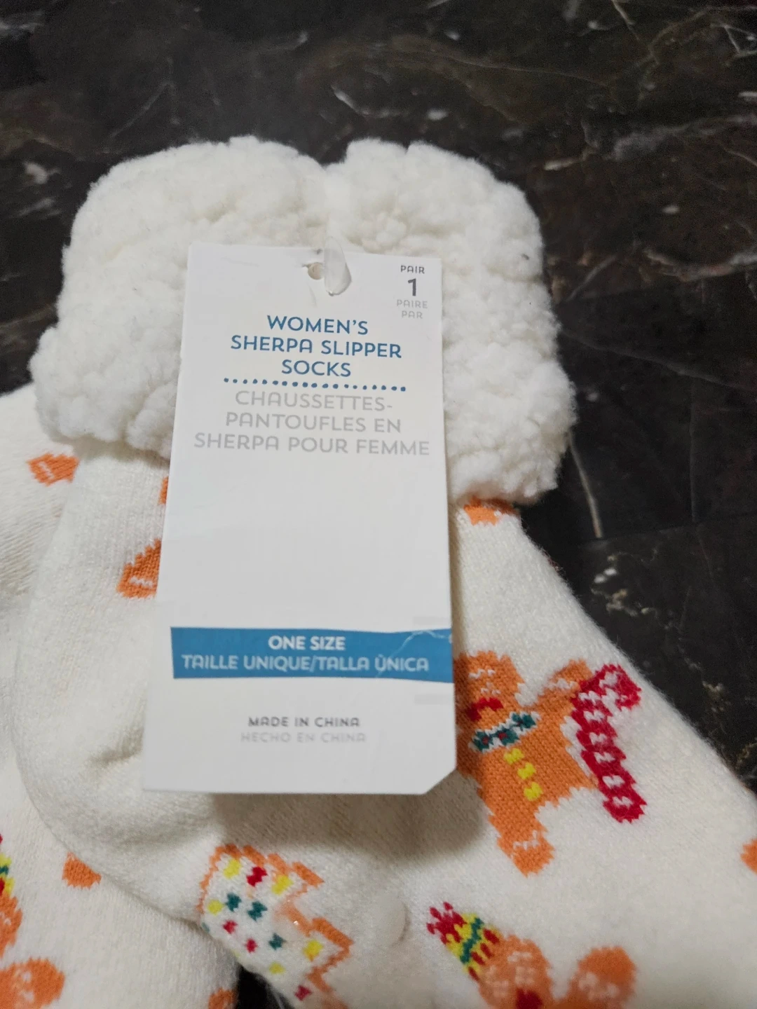 Cozy up this winter with these adorable women's sherpa slipper socks! They are one size and feature a cute gingerbread and star pattern. The shell is made of 77% acrylic, 13% polyester, 9% nylon, and 1% spandex, with a 100% polyester lining. Originally bought for $9.94. Old Navy.