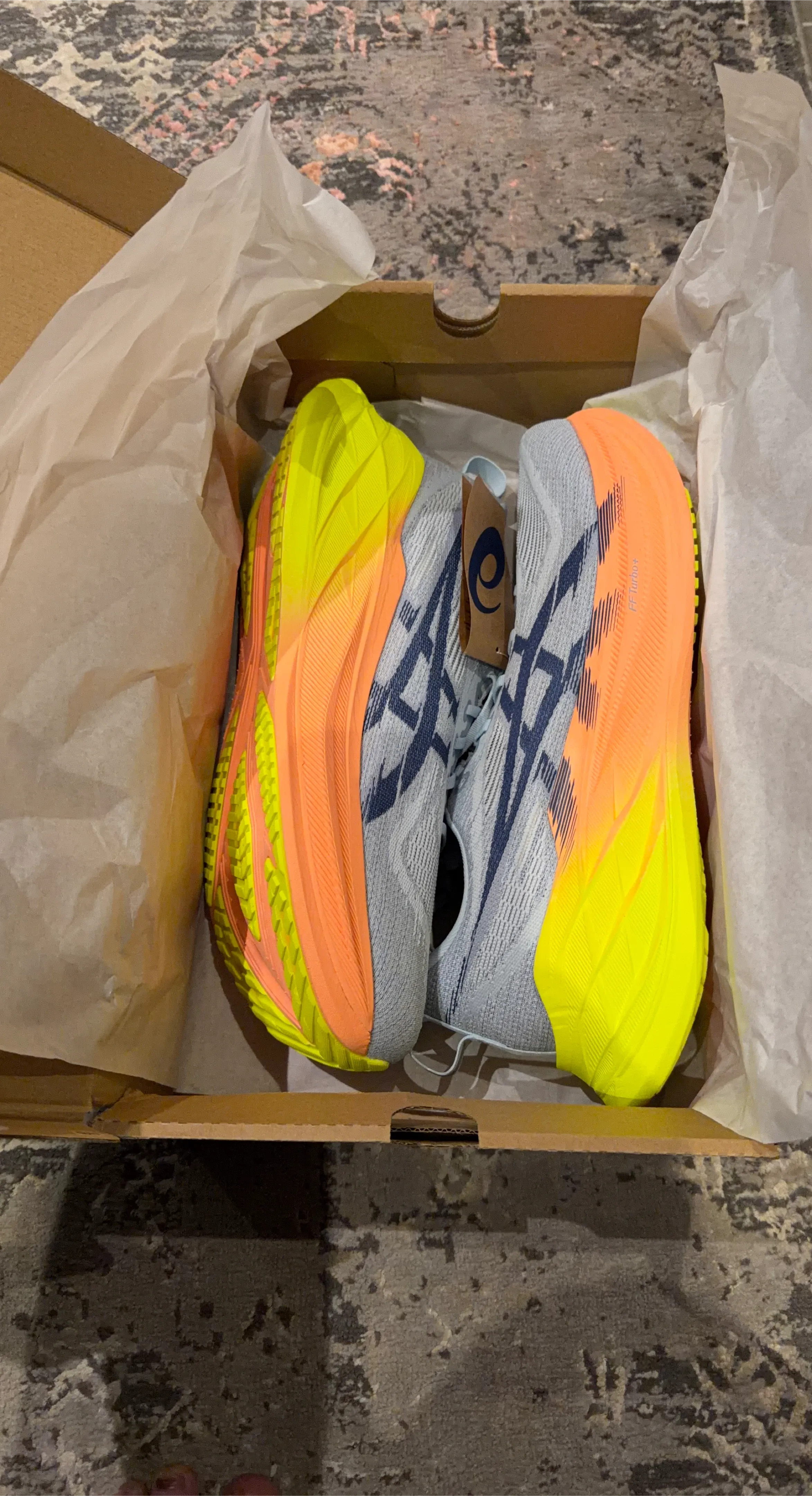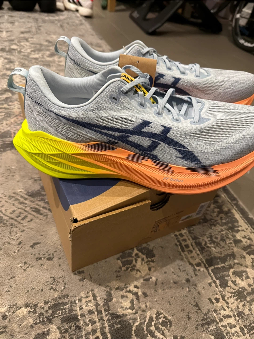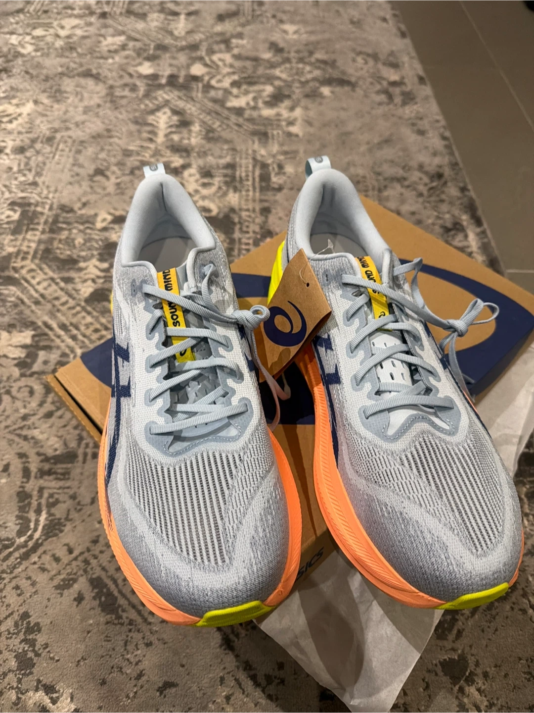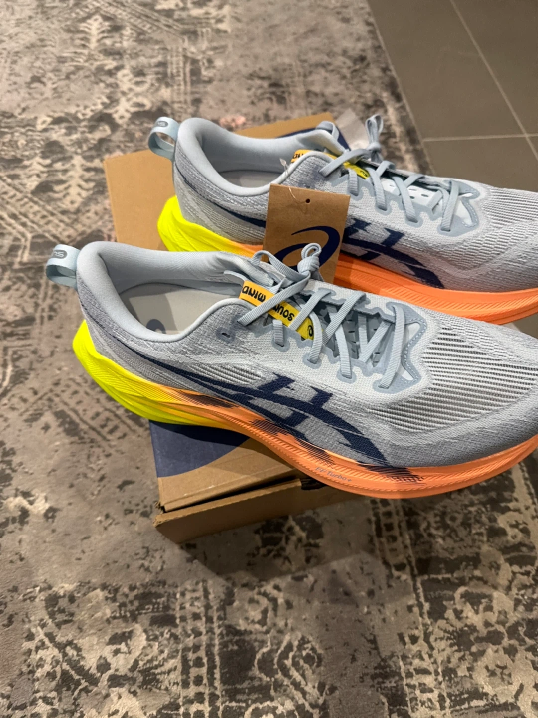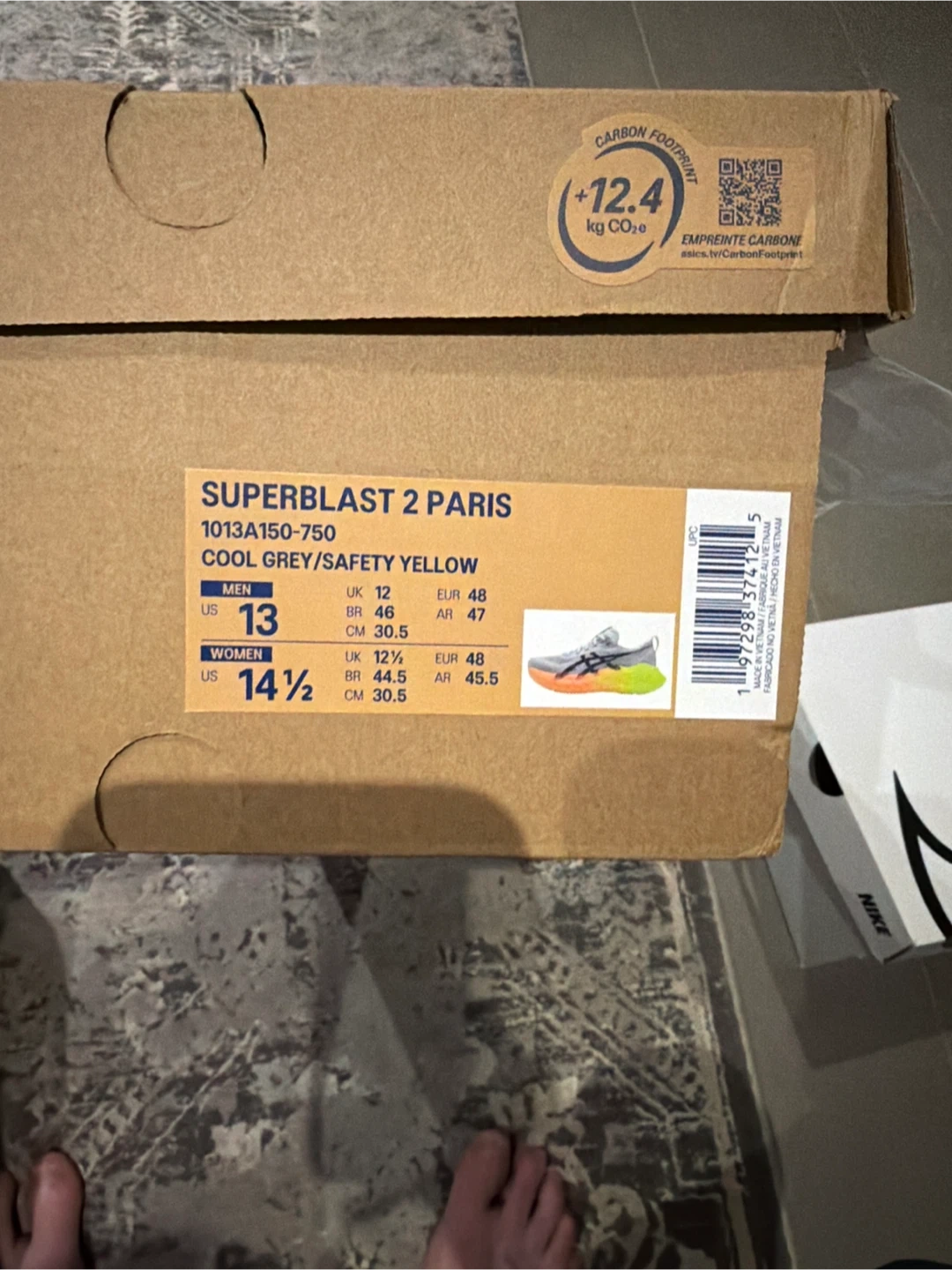 Selling a pair of Asics Superblast 2 Paris running shoes in men's size US 13. The colour is cool grey and safety yellow. They come with the original box