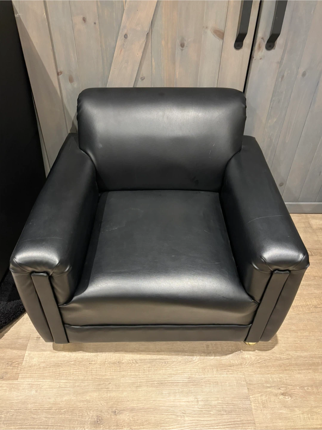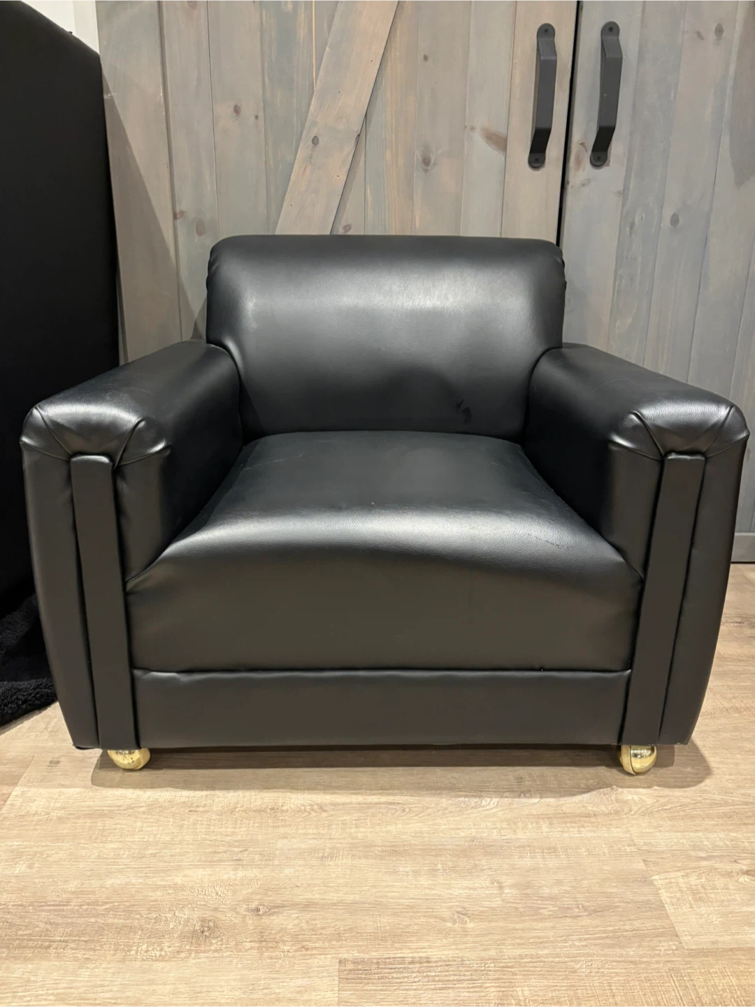 Here's a comfy black leather armchair! It's in great shape and ready for a new living room or den. Perfect for relaxing with a good book or watching TV