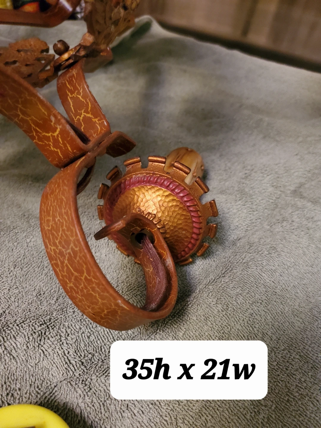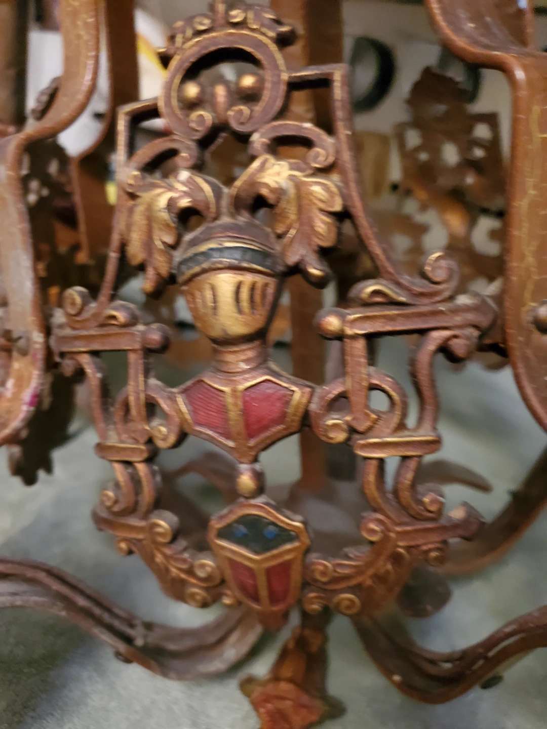 Selling a vintage metal chandelier with ornate details. It features a unique design with what looks like knight emblems. It has a beautiful, aged look that would add character to any room. Please note it shows signs of wear consistent with its age. They were working perfectly when taken down. You would need hanging hardware.
