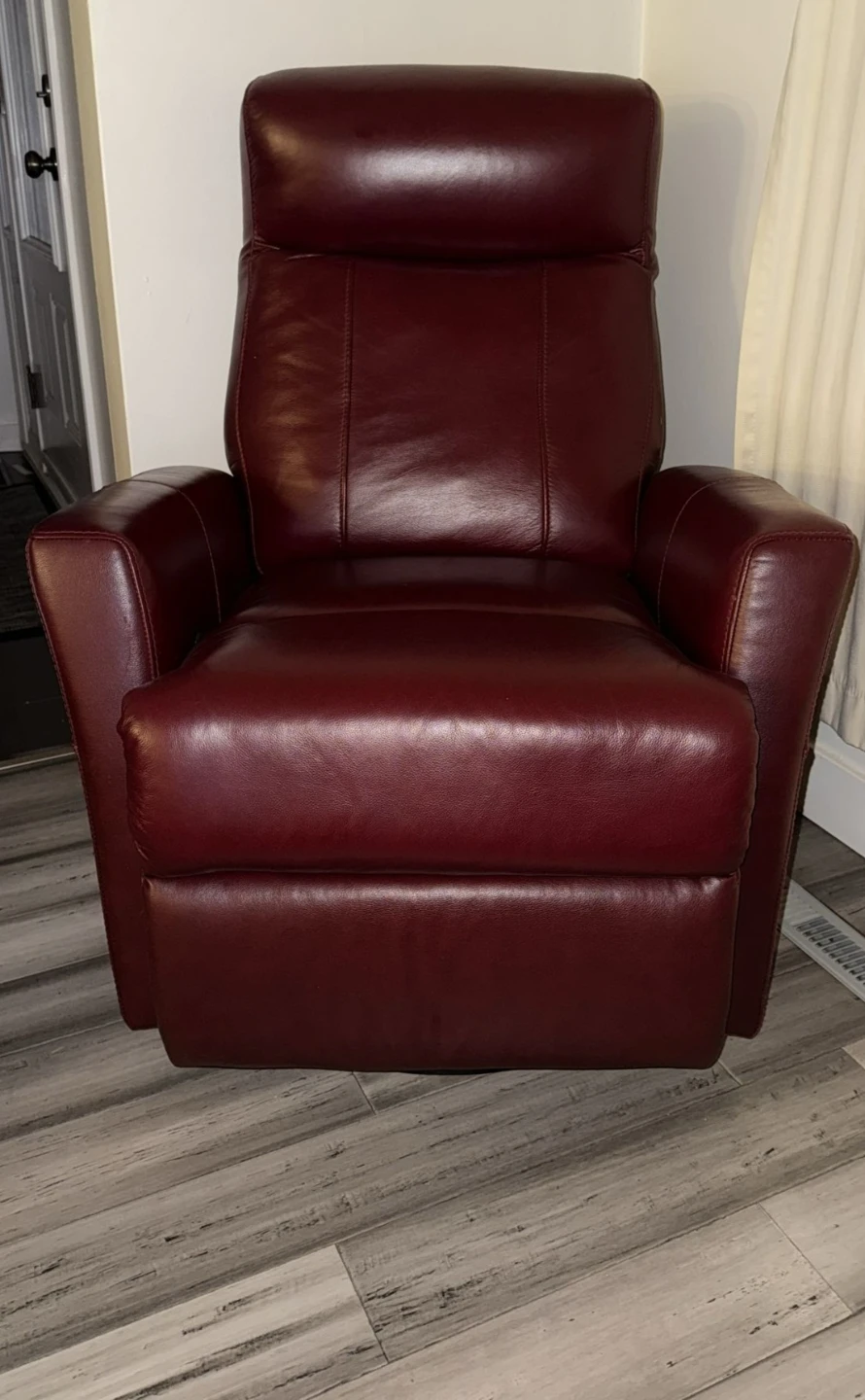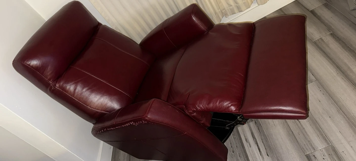 Selling a comfy burgundy leather recliner chair! It's perfect for relaxing after a long day. it's in good condition and ready for a new home. Rarely used.