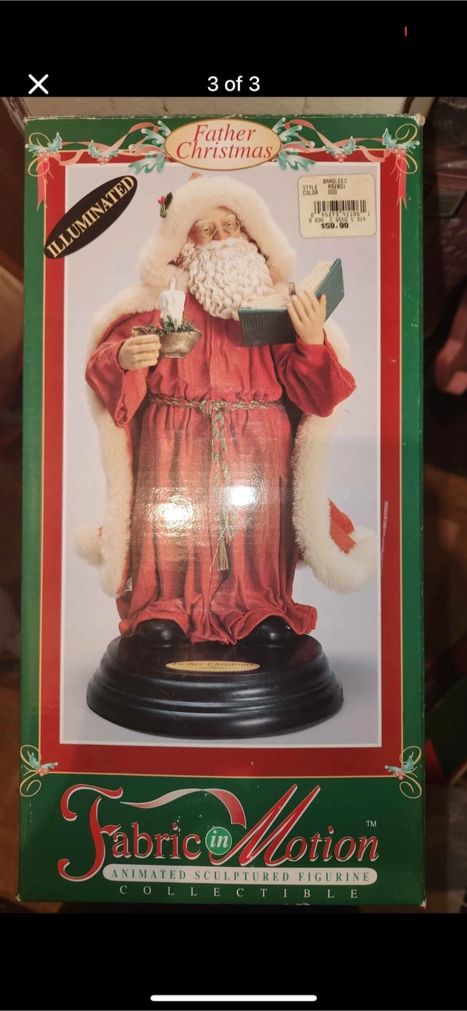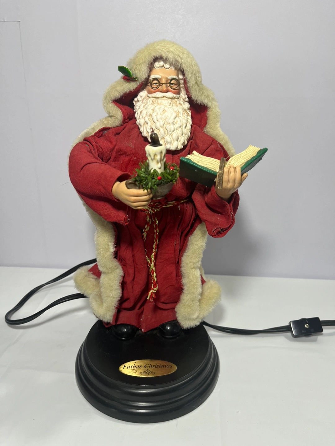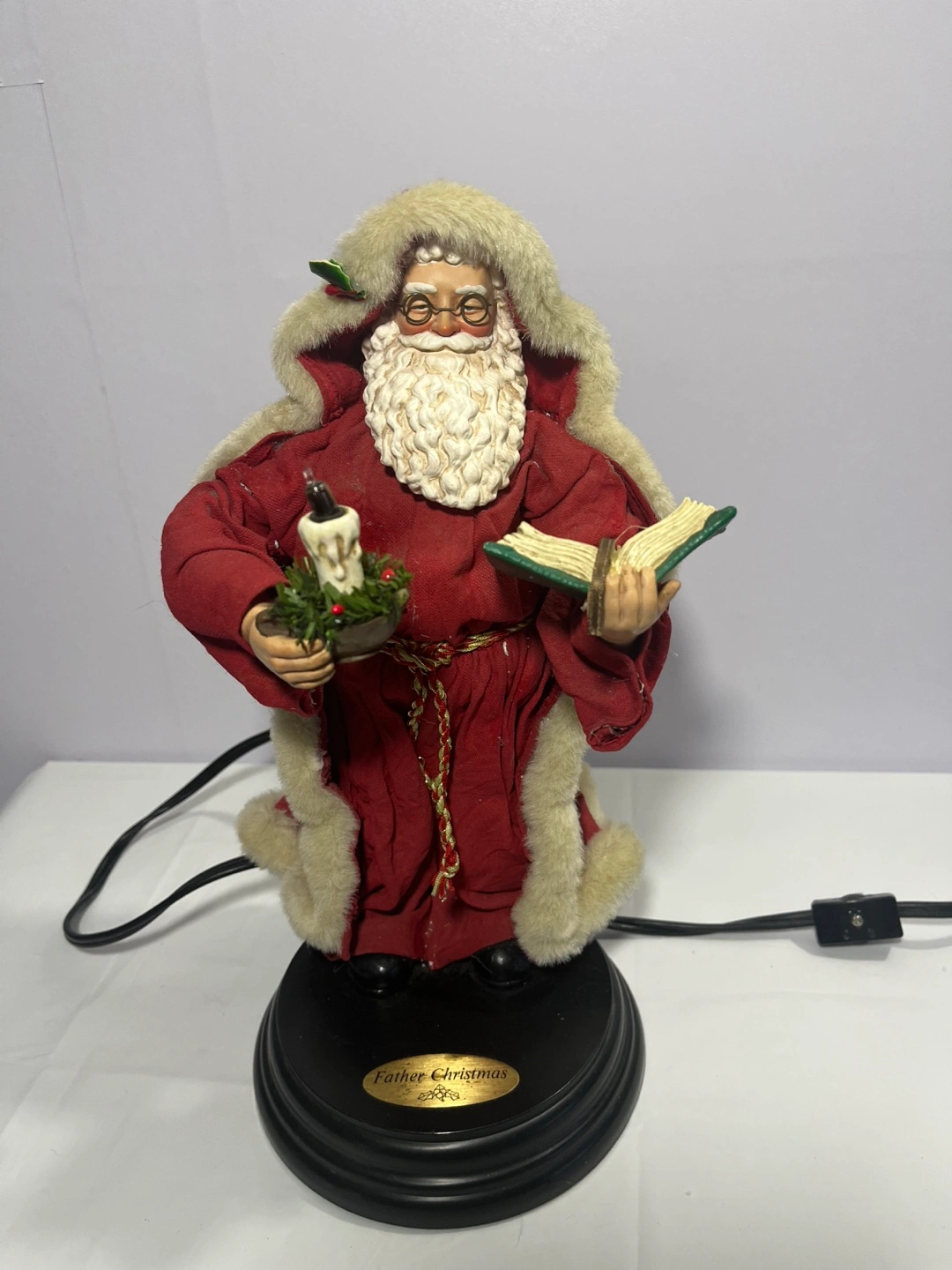 Selling a charming Father Christmas figurine! It's in great shape and ready to bring some holiday cheer to your home. The figurine features Father Christmas holding a book and a candle light up and move, powered cords. It's a delightful piece!