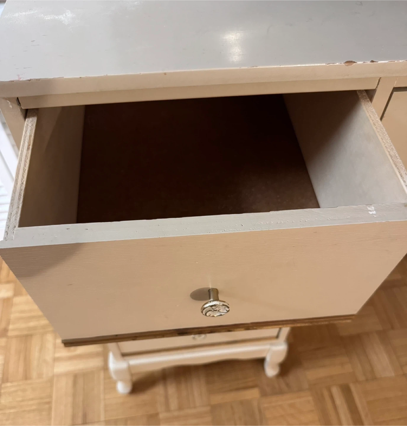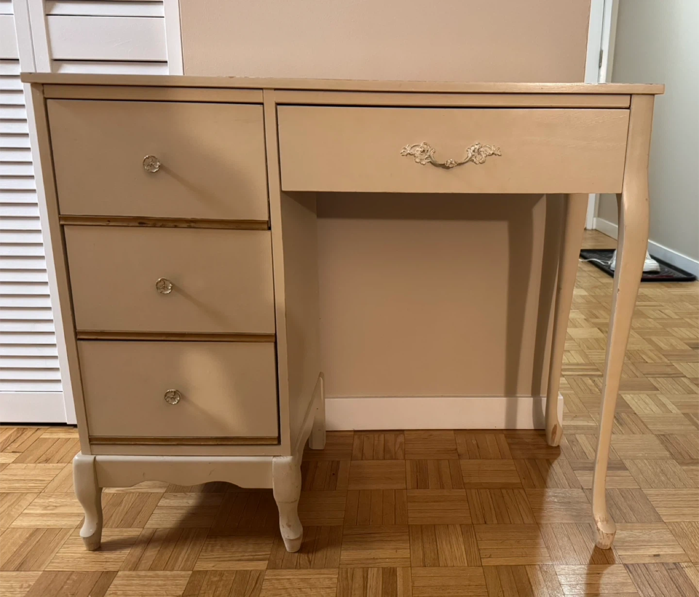 Cute cream-colored vintage-style desk with drawers. Can be used as a makeup vanity or writing desk.