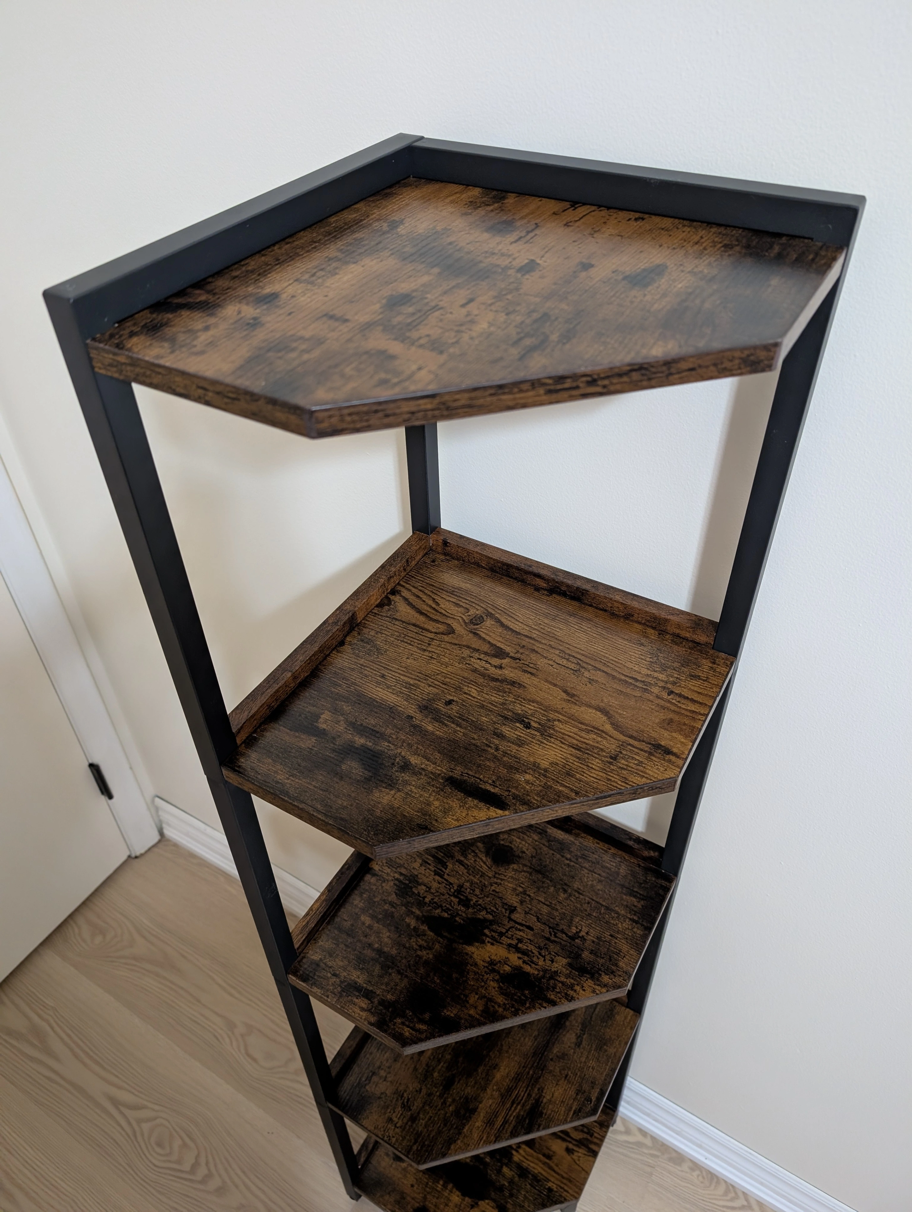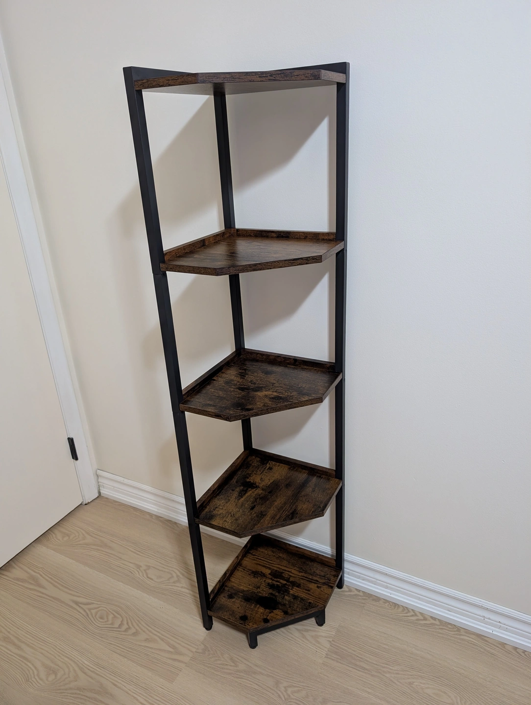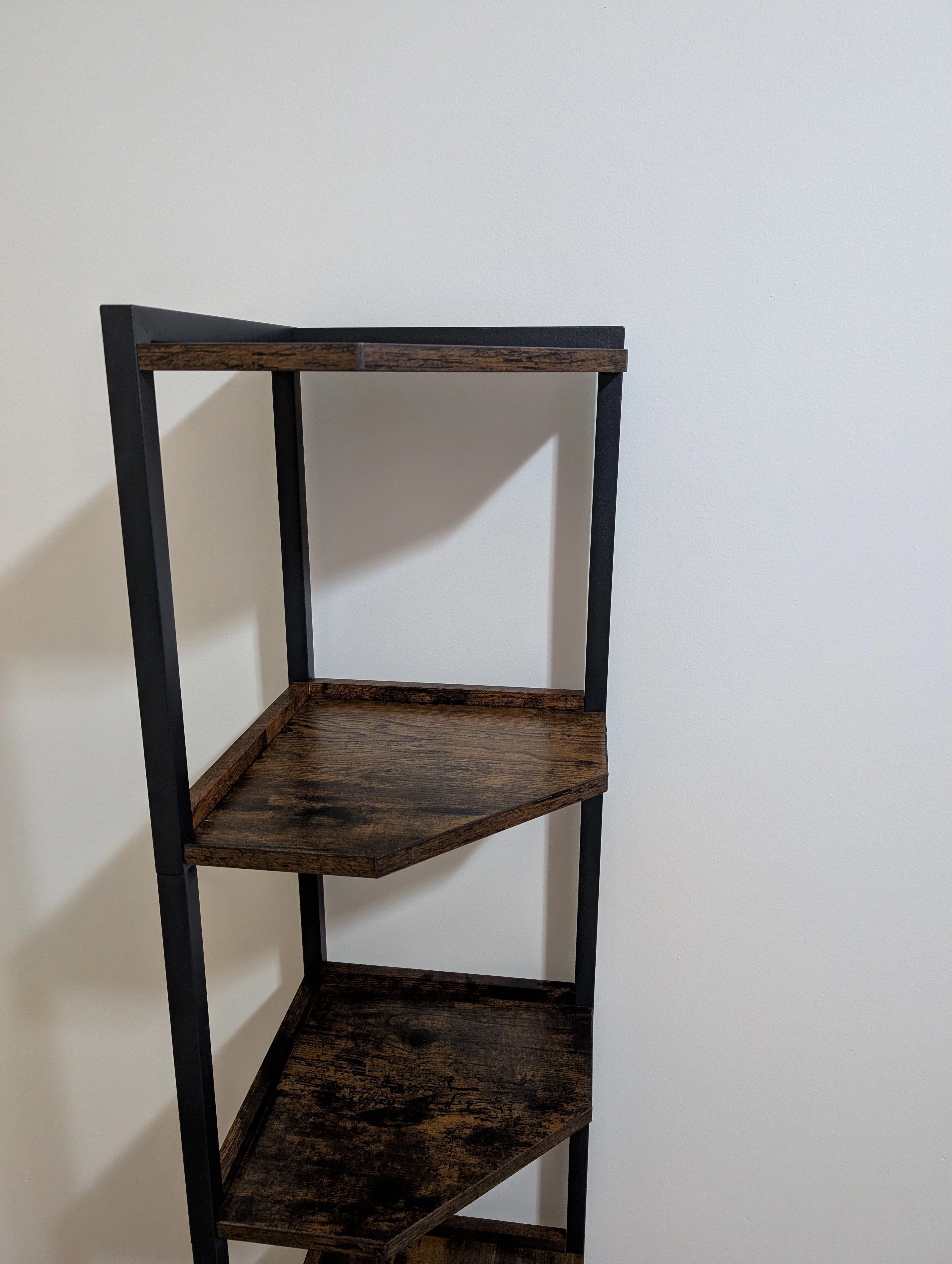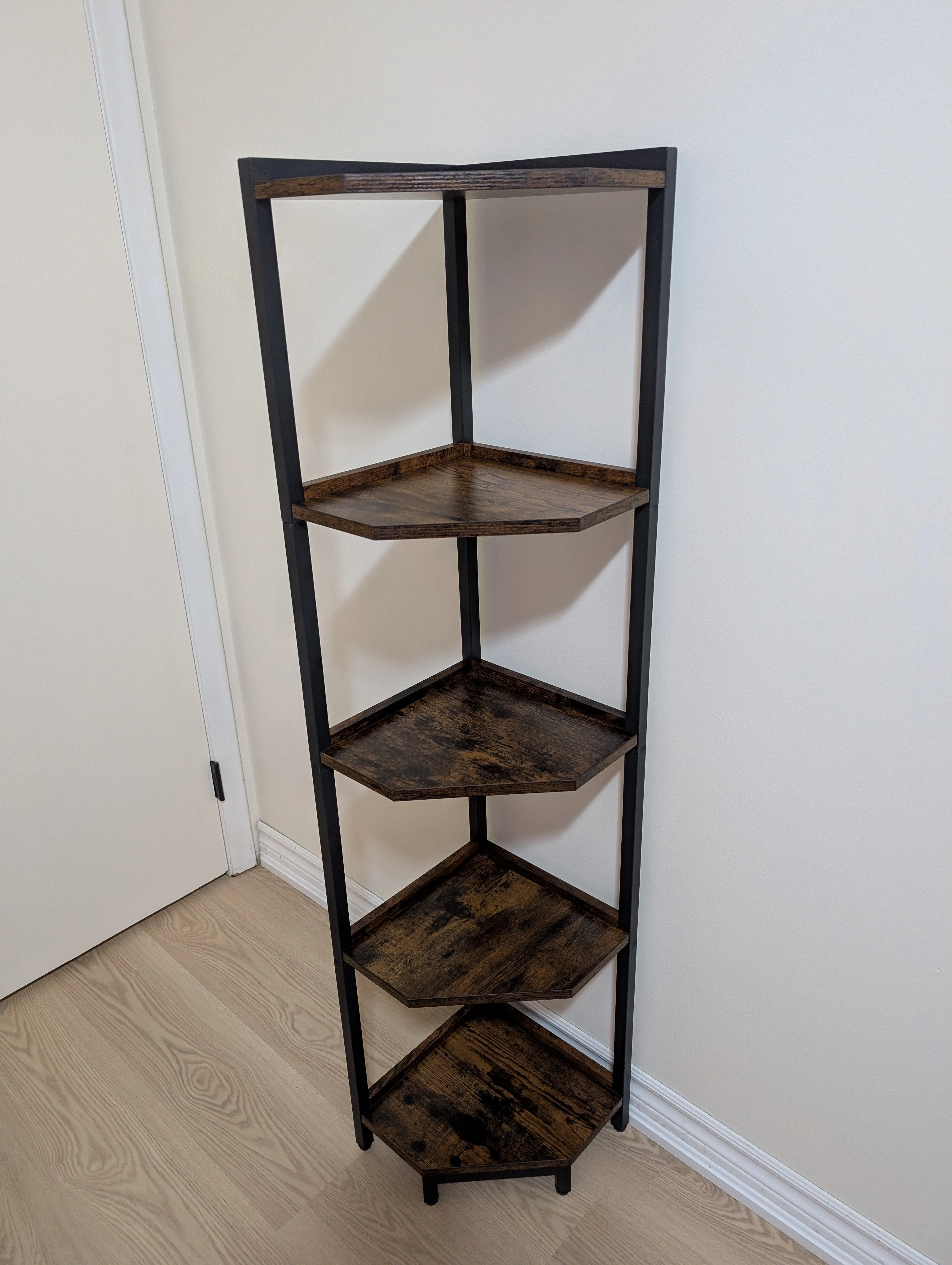 Selling a corner shelf with 5 tiers! It's a great way to save space and add some storage to any room. The shelves have a dark brown wood look, and the frame is black. Perfect for books, plants, or decor