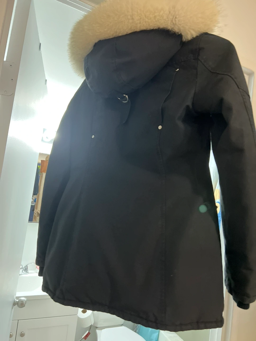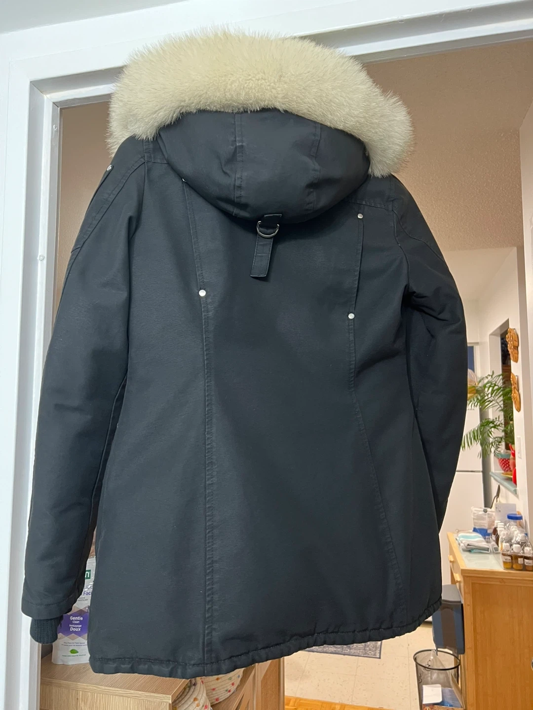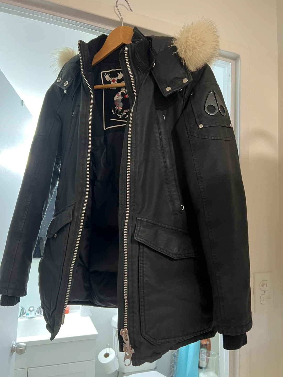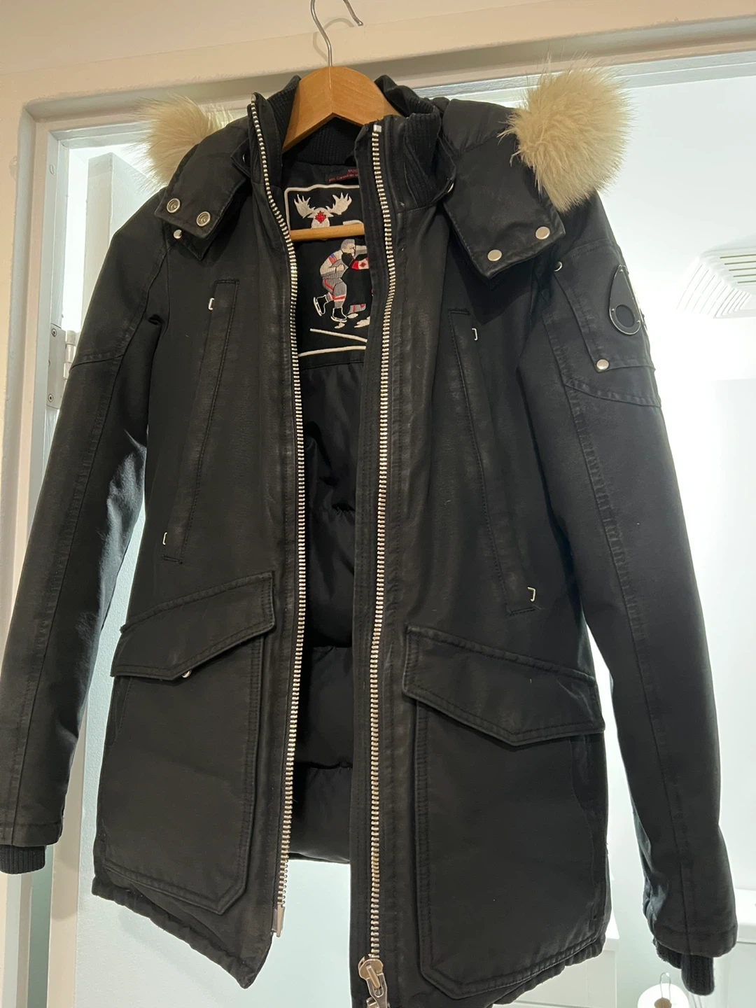 Selling a Moose Knuckles winter jacket in black. It's in great condition and ready for the cold weather! The jacket features a fur-trimmed hood.