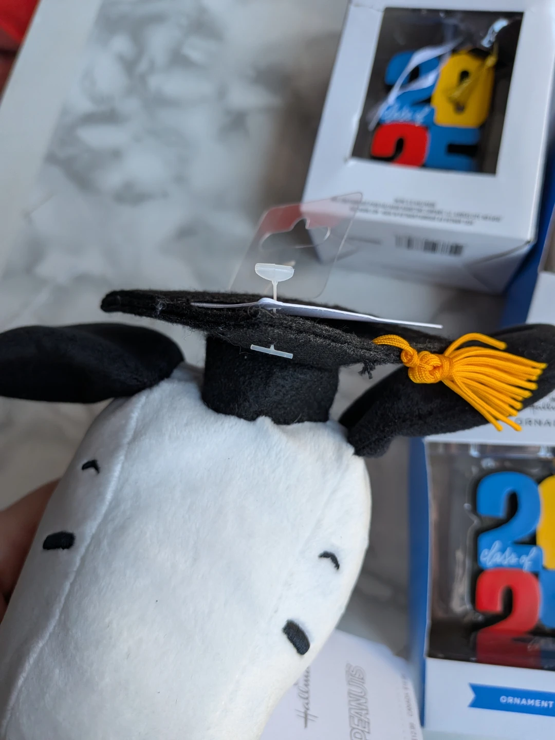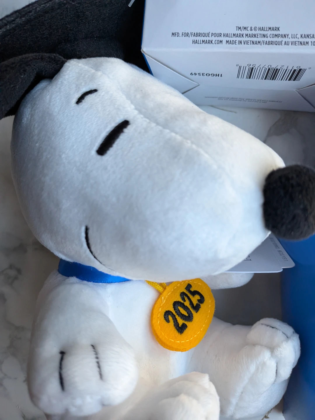 This is a brand new Hallmark Snoopy plush ornament, perfect for a 2025 graduation gift! It features Snoopy wearing a graduation cap with a '2025' tag. The ornament comes in its original box, plus three additional grad ornaments