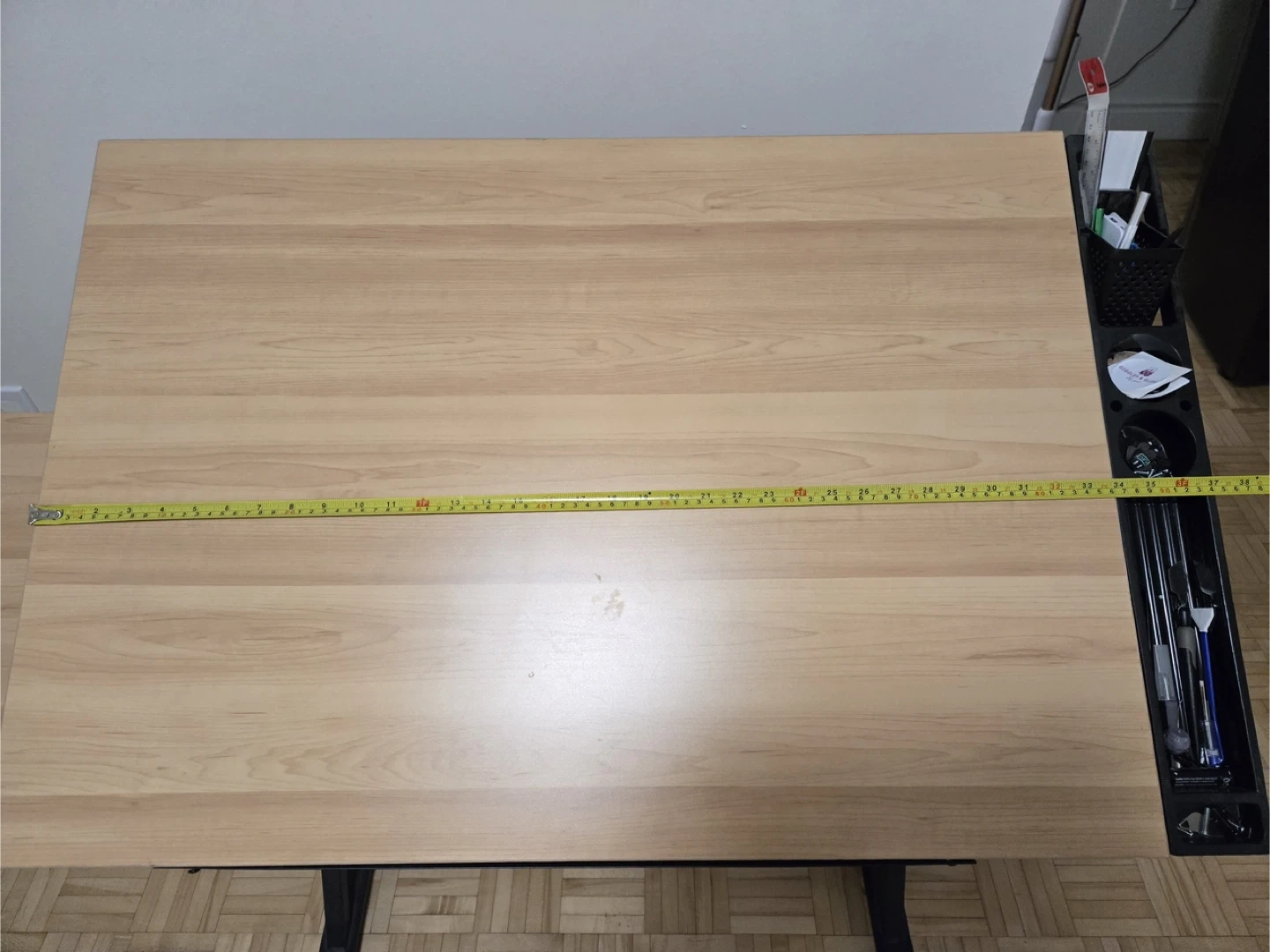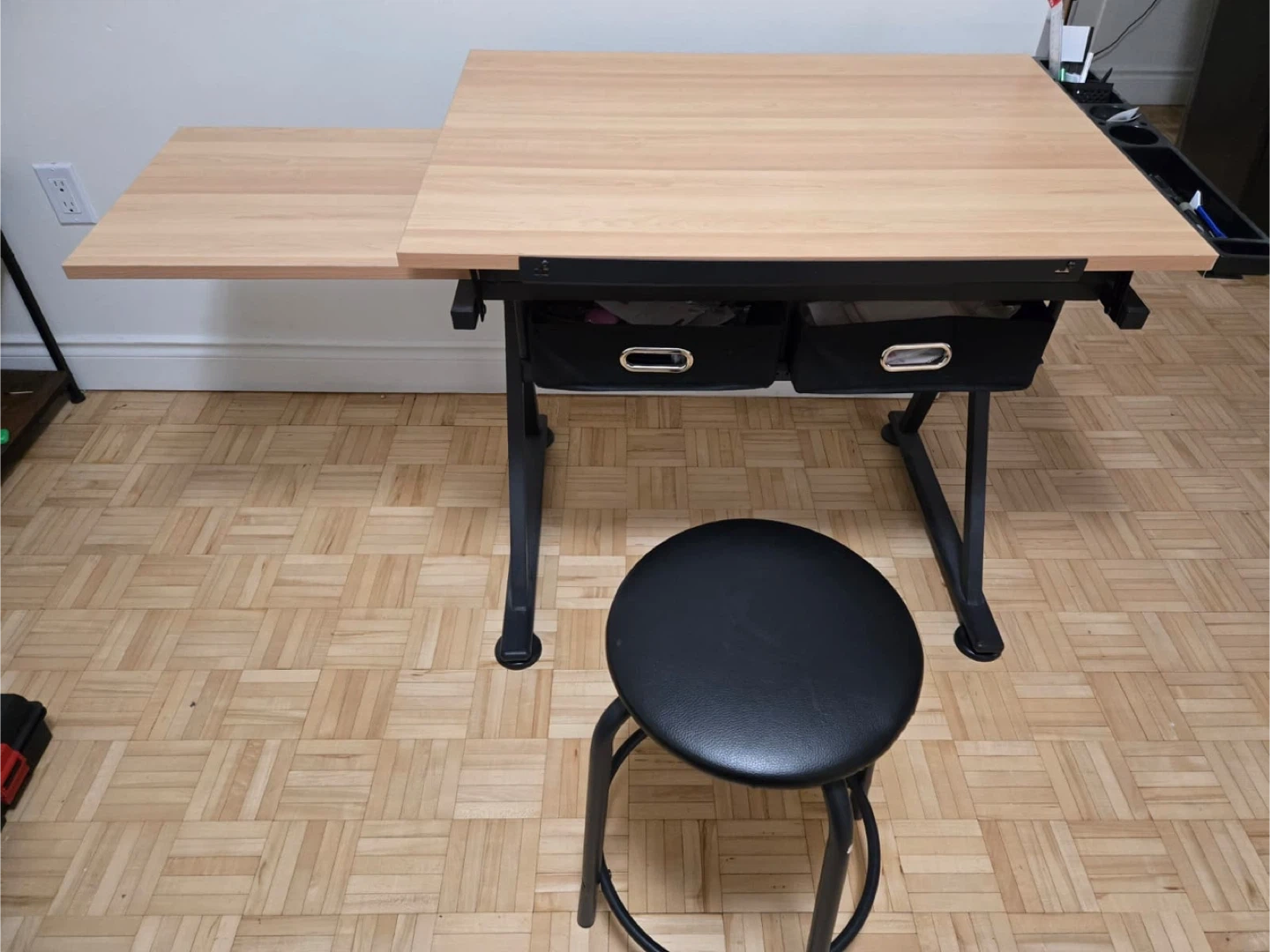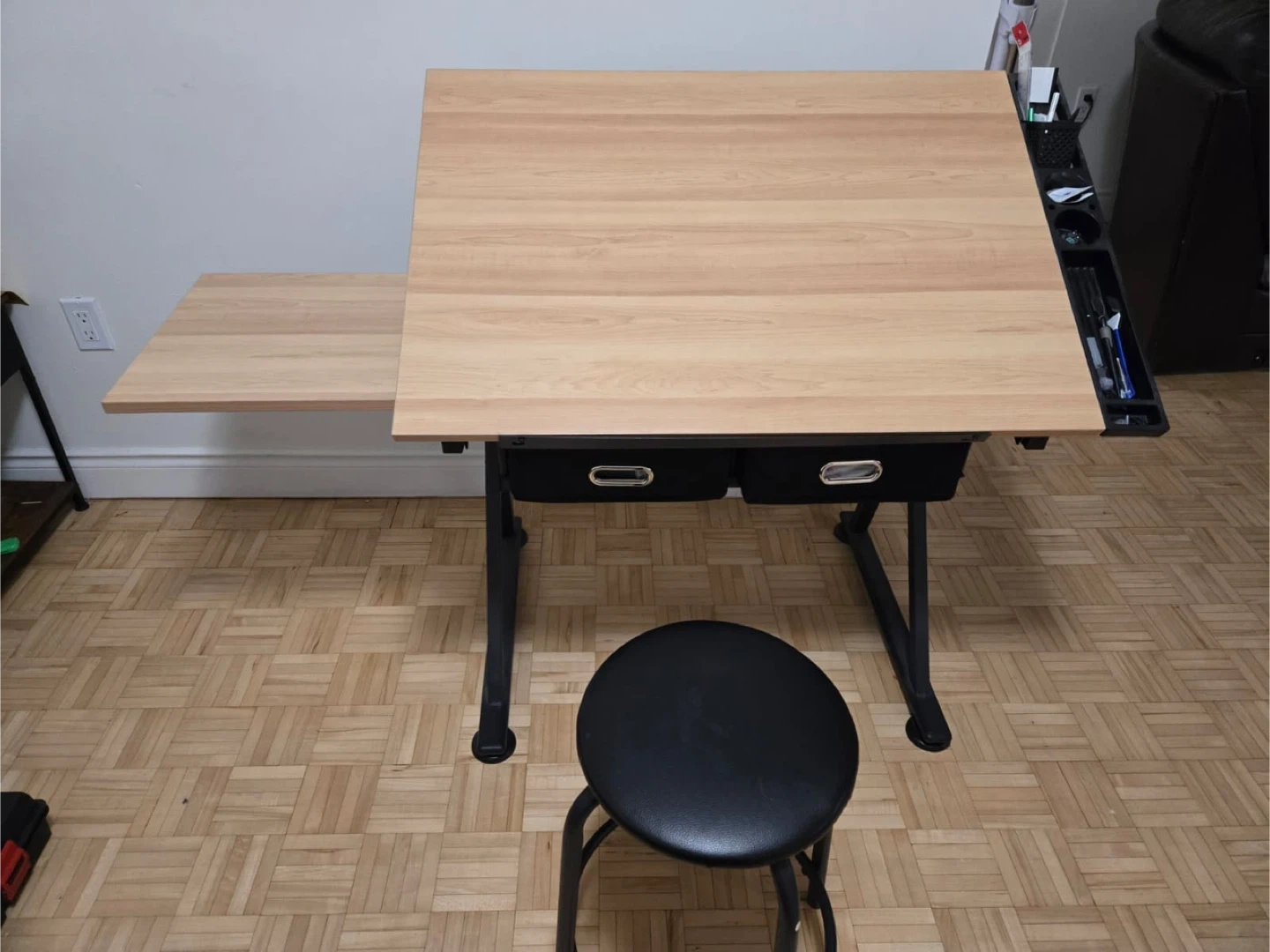 Selling an adjustable drafting table, perfect for artists or designers! It comes with a stool. The table features a side tray and two drawers for convenient storage of your supplies. It's in great condition.