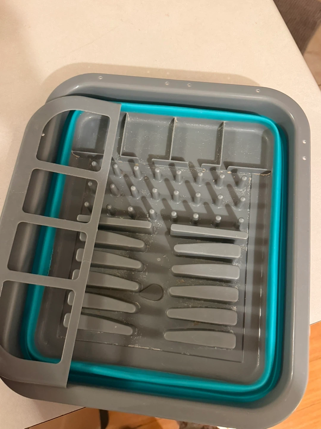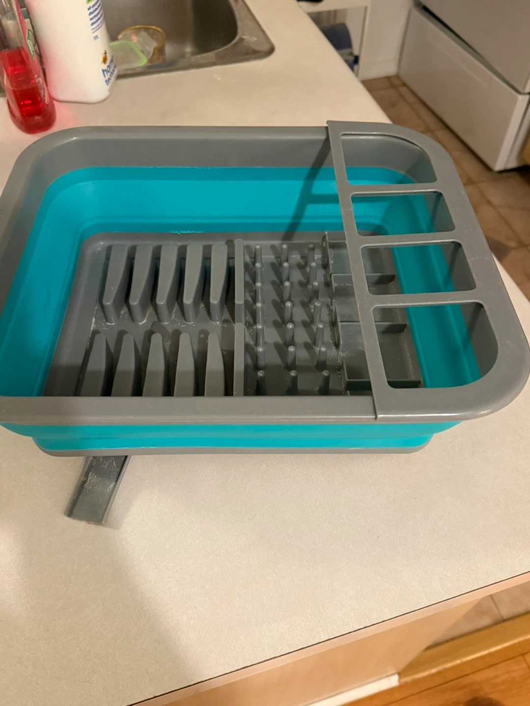 Selling a handy collapsible dish rack! It's in great condition and perfect for saving space in your kitchen. The rack features a grey frame with teal accents, making it a stylish addition to your sink area. It's lightweight and easy to store when not in use