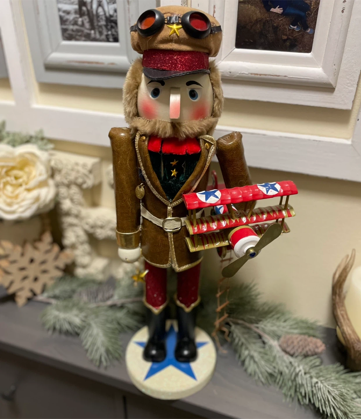 Here's a fun and unique wooden nutcracker dressed as an aviator! He's holding a little biplane and would make a great addition to your holiday decor or collection. Originally purchased from Bombay, stands approximately 20” tall.