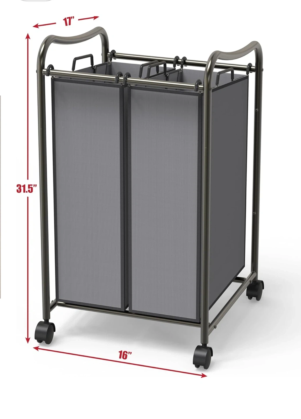 This laundry sorter cart is perfect for keeping your laundry organized! It features a sturdy metal frame with smooth-rolling wheels, making it easy to move from room to room. The cart has multiple compartments, so you can sort your clothes by colour or type. Dimensions are approximately 17" x 16" x 31.5".