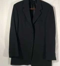 Elevate your wardrobe with this classic black suit, perfect for any professional or formal occasion. This slightly worn suit features a timeless design with a notched lapel, button closure, and a comfortable fit. Please note that it is in used condition. While exact specifications aren't available, its versatile style makes it a great addition to any wardrobe. Ready to add a touch of sophistication to your look? And hey, if the ad is up, it's still up for grabs!