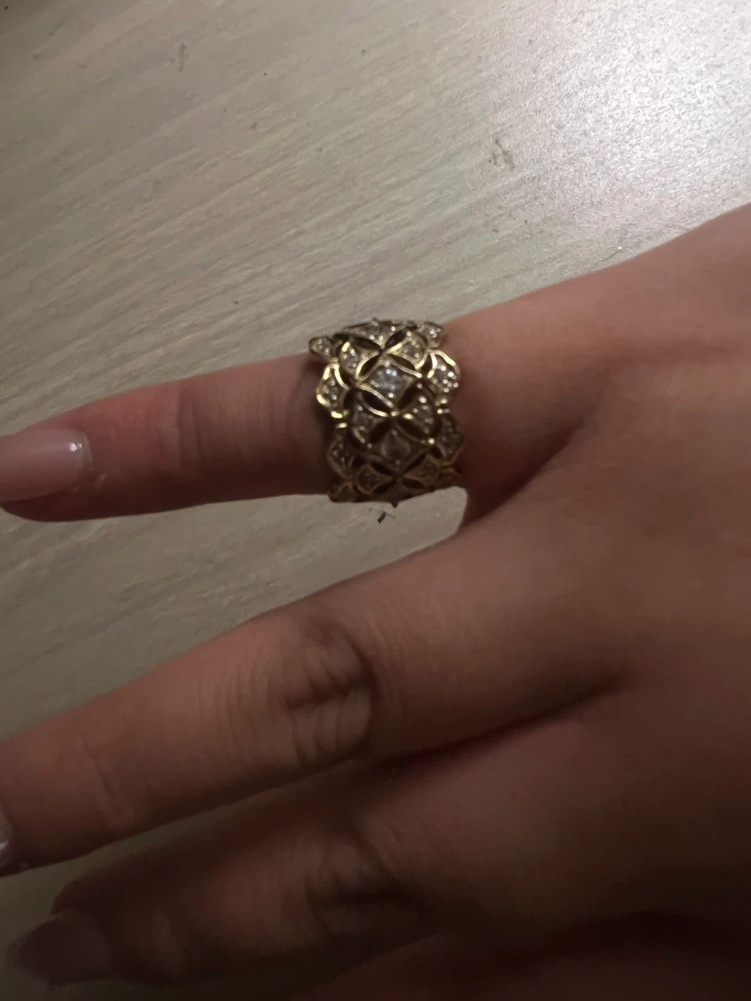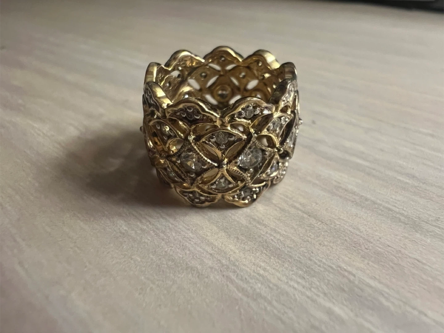 Selling a beautiful gold ring. It has an intricate design with what looks like small stones set within the gold filigree. It's in great condition and ready to wear!