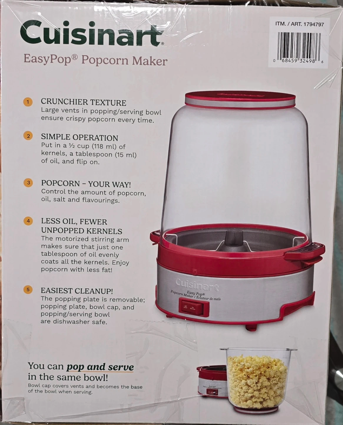 Enjoy crispy popcorn every time with its large vents in the popping/serving bowl. The popping plate, bowl cap, and popping/serving bowl are dishwasher safe for easy cleanup